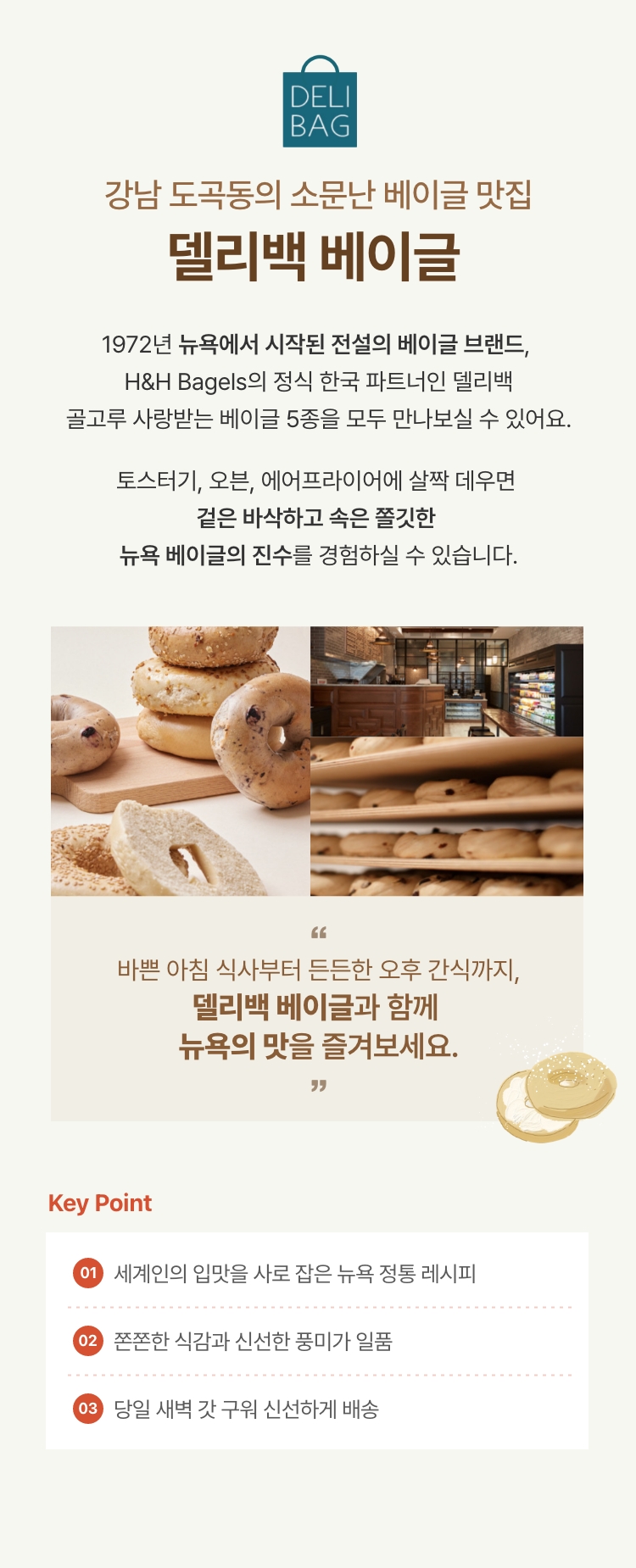 바쁜 아침 식사부터 든든한 오후 간식까지, 델리백 베이글과 함께 뉴욕의 맛을 즐겨보세요.