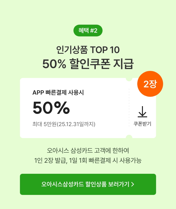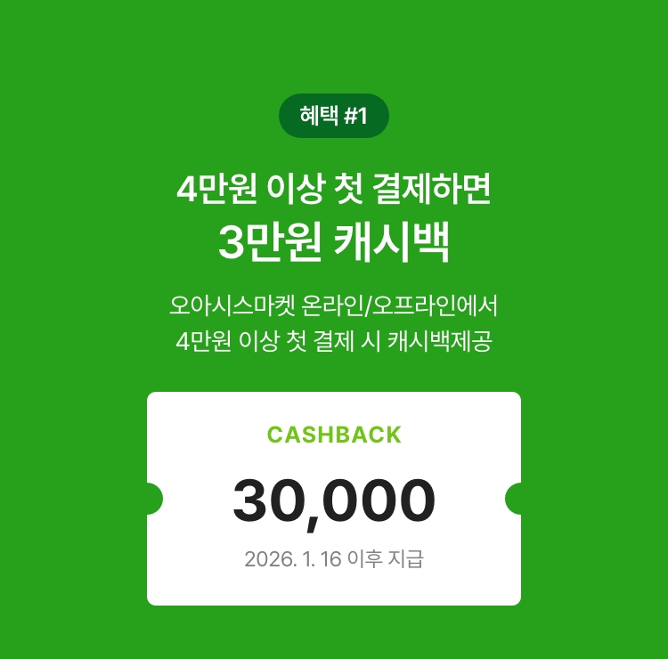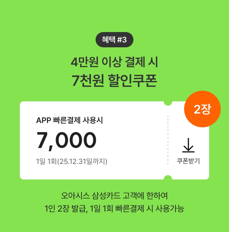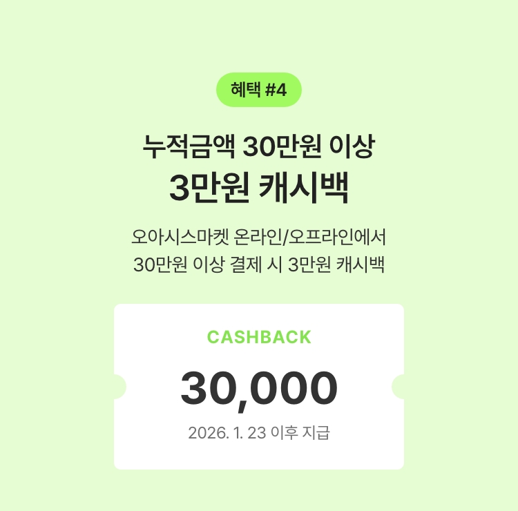 네이버페이, 카카오페이, PAYCO, Paypal, 유비페이 등을 통한 간편결제, 일반결제, 오아시스 페이카드, 기타결제수단은 혜택적용 제외