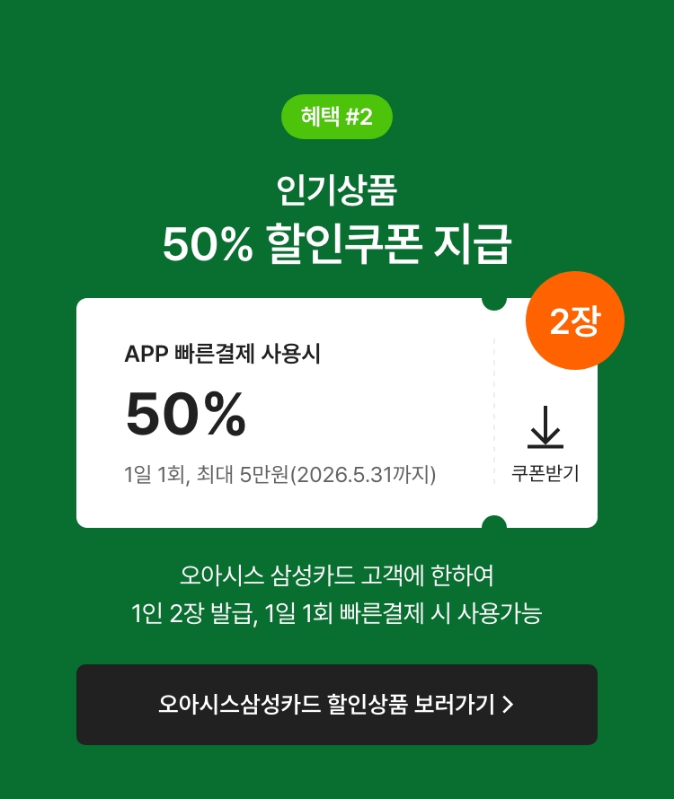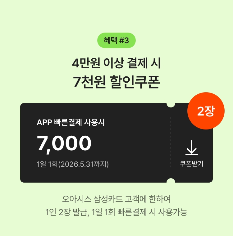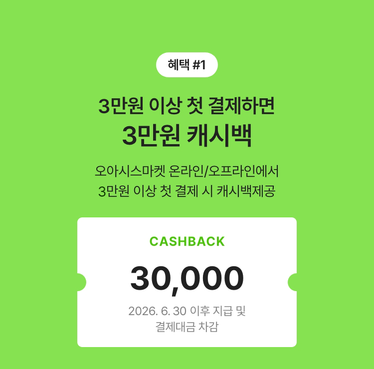 네이버페이, 카카오페이, PAYCO, Paypal, 유비페이 등을 통한 간편결제, 일반결제, 오아시스 페이카드, 기타결제수단은 혜택적용 제외