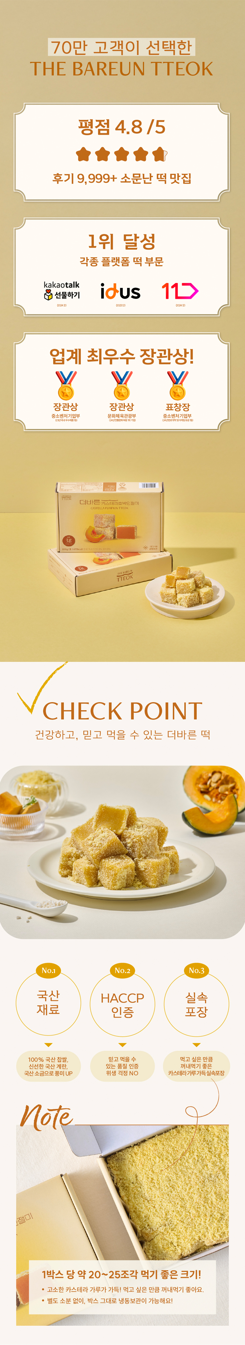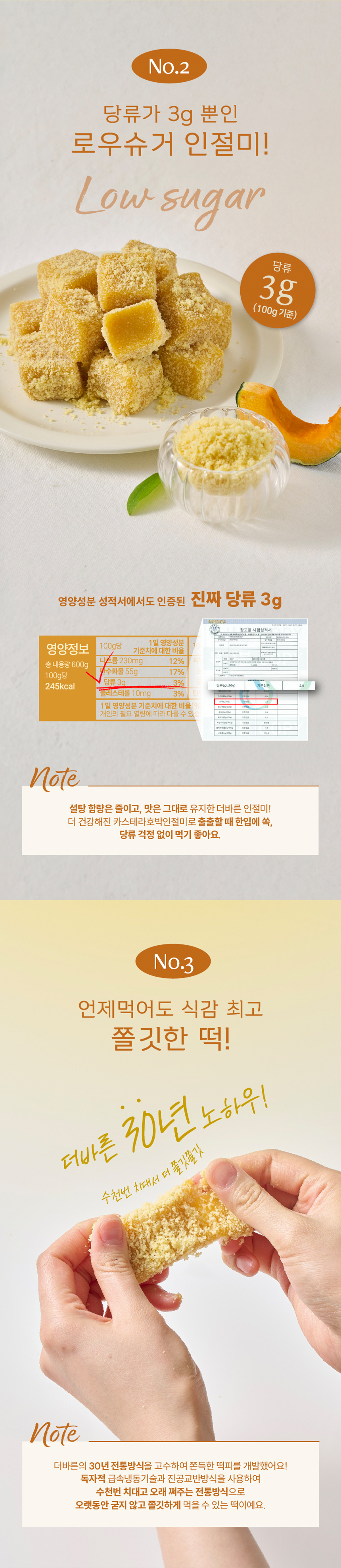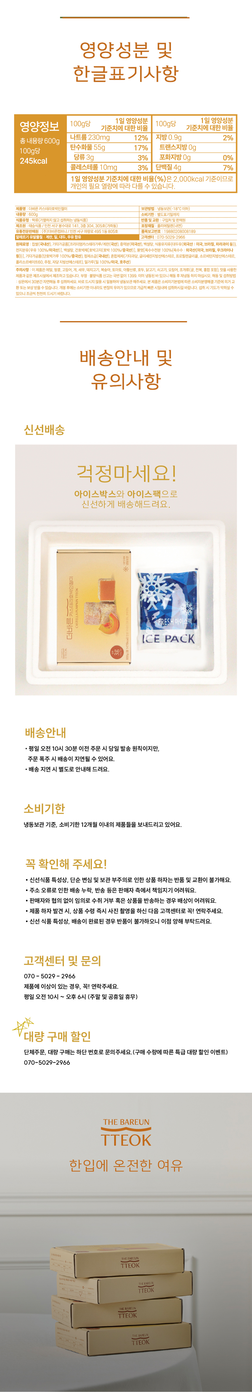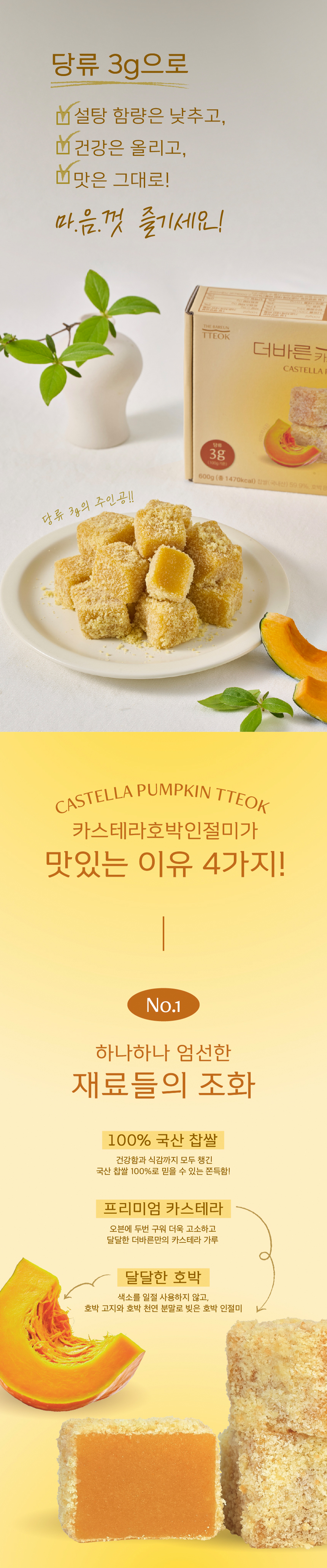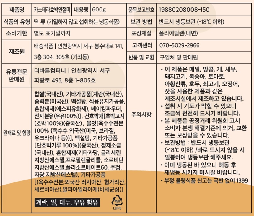 찹쌀(국내산), 기타가공품[계란(국내산), 중력분(미국산), 백설탕, 식용유지가공품, 혼합제제(에스피유화제), 베이킹파우다, 전지분유), 건호박채[호박고지(호박 100%)(중국산) , 물엿[옥수수전분100% {옥수수 외국산(미국, 브라질, 우크라이나 등)}], 백설탕, 기타가공품[단호박가루 100%](중국산), 정제소금(국내산), 혼합제제(기타과당, 글리세린지방산에스텔,프로필렌글리콜, 소르비탄지방산에스텔,폴리소르베이트60, 주정, 자당 지방산에스텔), 기타가공품[(옥수수전분;외국산 러시아산, 헝가리산,세르비아산), 알파아일라아제(비세균성)]