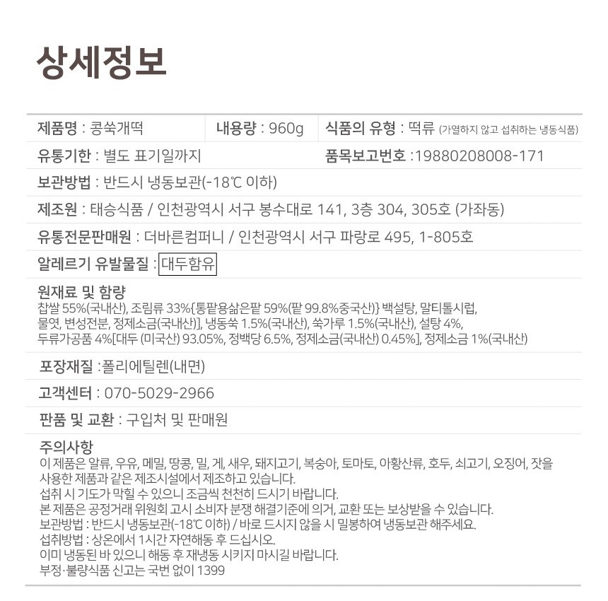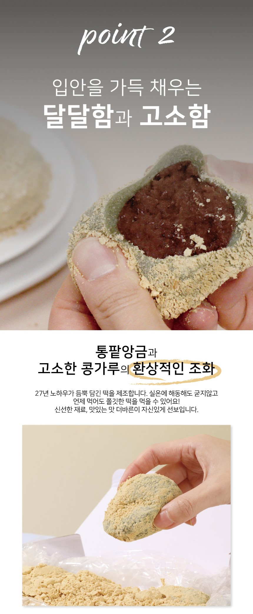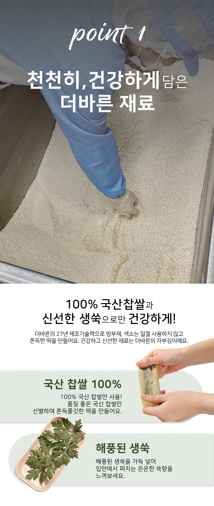 찹쌀(국내산), 조림류[통팥용삶은팥(중국산), 백설탕, 말티톨시럽, 물엿, 변성전분, 정제소금(국내산)], 백설탕, 두류가공품[대두(미국산, 정백당 ,정제소금(국내산)], 물엿[옥수수전분100% {옥수수 외국산(미국, 브라질, 우크라이나 등)}], 냉동쑥(국내산), 쑥가루(국내산), 정제소금(국내산), 혼합제제(기타과당, 글리세린지방산에스텔,프로필렌글리콜, 소르비탄지방산에스텔,폴리소르베이트60, 주정, 자당 지방산에스텔), 기타가공품[(옥수수전분;외국산 러시아산, 헝가리산,세르비아산), 알파아일라아제(비세균성)]
