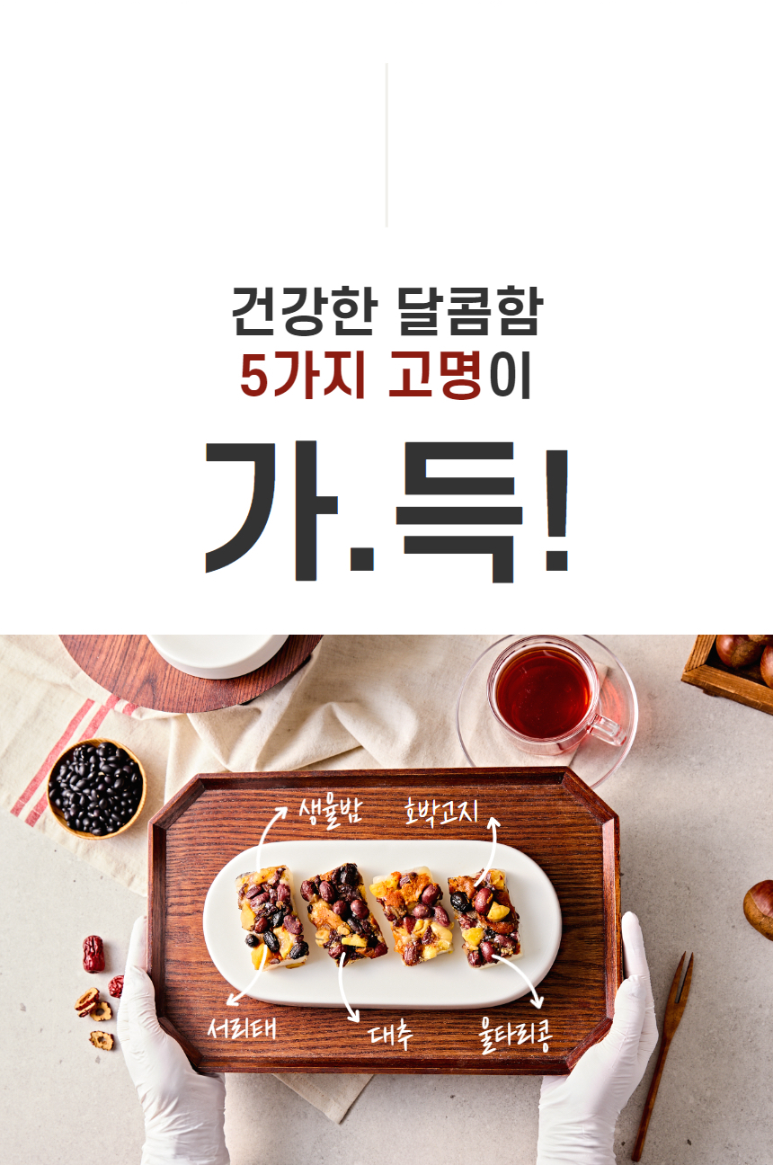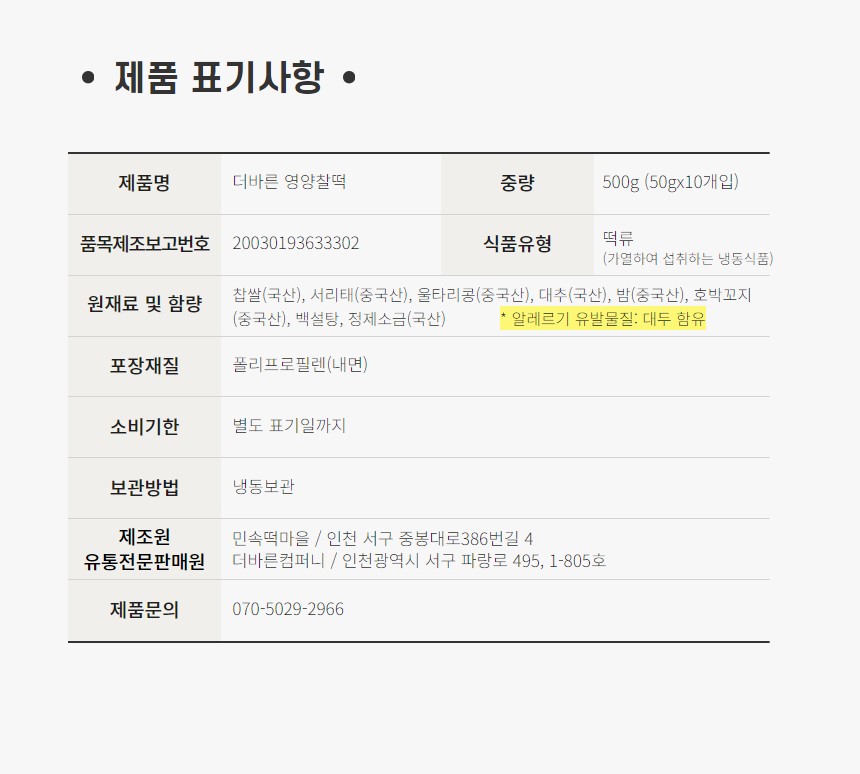 찹쌀(국산), 서리태(중국산), 울타리콩(중국산), 대추(국산), 밤(중국산), 호박꼬지(중국산), 백설탕, 정제소금(국산)