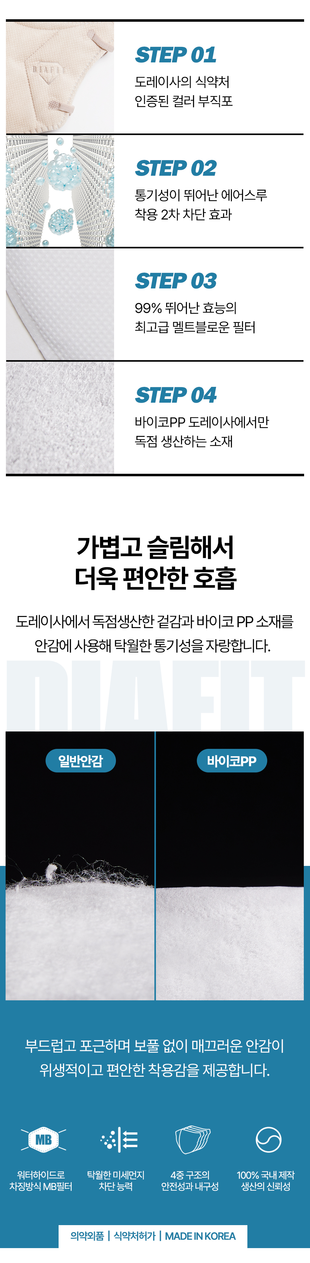 겉감(부직포), 중간제(부직포), 필터(멜트블로운), 안감(부직포), 코편(폴리프로필렌피복철사), 귀끈(나일론폴리우레탄)