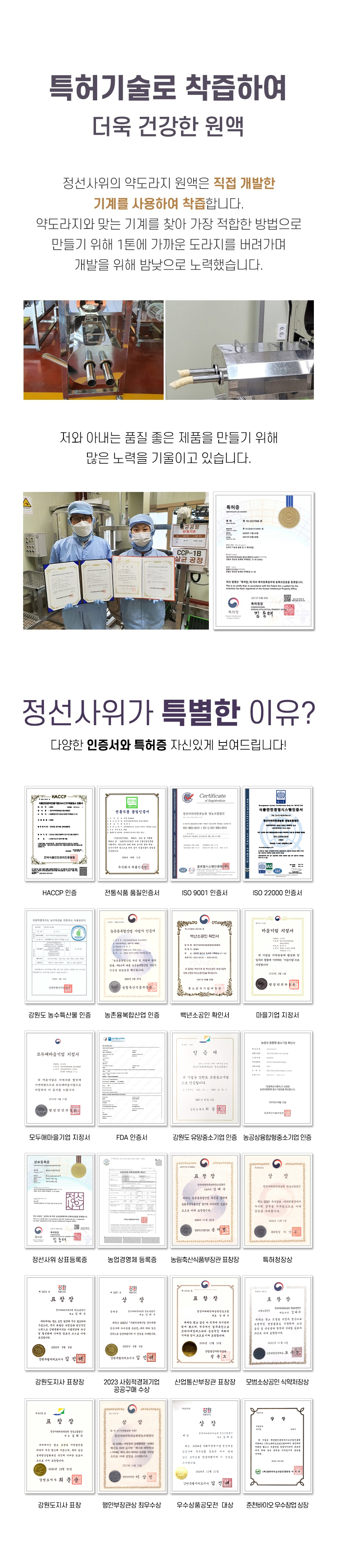 정선에서 직접 재배한 3년근 이상의 약도라지를 특허기술로 100% 착즙하여 약도라지 그대로 담았으며 48시간이상 저온숙성하여 아린맛을 감소시키고 건강한 단맛을 내게 할 프락토올리고당을 일정 비율로 배합하여 약도라지의 아린맛을 감소시키고 영양손실이 적어 환절기 건강에 도움을 주는 제품 입니다.