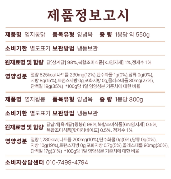 옛날통닭 : 닭[삼계닭] 98%,복합조미식품[KJ염지제] 1%,정제수 1% / 윙봉 : 닭날개[육계닭(윙봉)] 98%,복합조미식품[GN염지제] 0.5%,복합조미식품[핫마리네이드] 0.5%. 정제수 1%