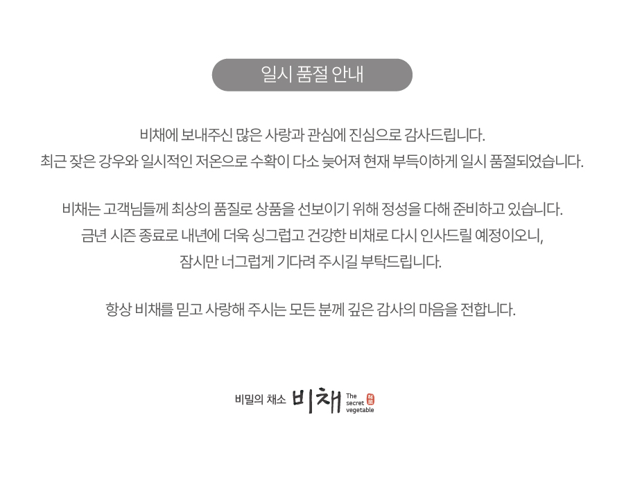 비채 비타참(700g 이상) 수량빼기 수량추가 9,000 원 총 수량 1 개 9,000 원 구매옵션 닫기 찜하기 추가 찜하기 삭제 구매후기 34 상품상세 정기구독 장바구니 정기구독 장바구니 01월01일 입고예정 정기배송 장바구니