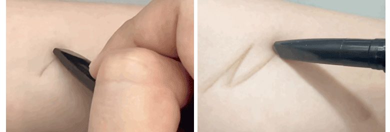 1.눈썹 앞머리는 넓은 면을 이용해서 한올 한올 심듯이 눈썹산을 향해 그려줍니다. 2.눈썹 꼬리까지는 얇은 면을 사용해서 세밀하게 그려줍니다.