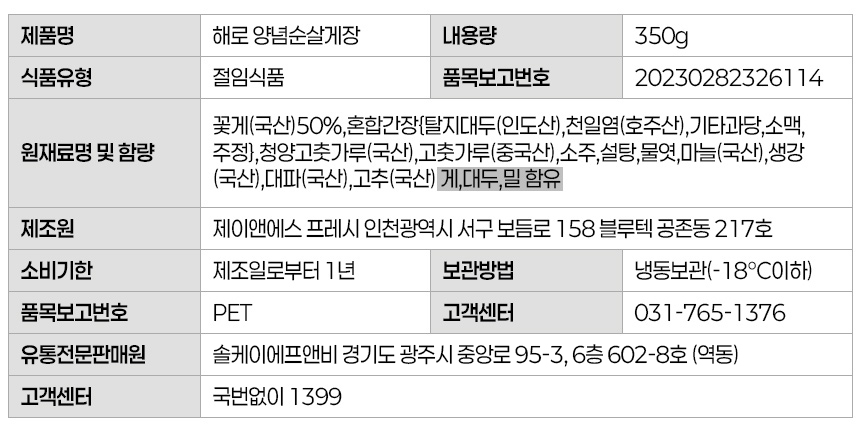 해로 양념순살게장 : 꽃게살(국산)50%,혼합간장{탈지대두(인도산),천일염(호주산),기타과당,소맥,주정},청양고춧가루(국산),고춧가루(중국산),소주,설탕,물엿,마늘(국산),생강(국산),대파(국산),고추(국산)