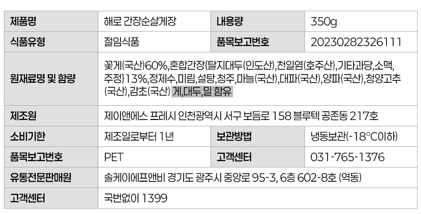 해로 간장순살게장 : 꽃게살(국산)60%,혼합간장{탈지대두(인도산),천일염(호주산),기타과당,소맥,주정}13%,정제수,미림,설탕,청주,마늘(국산),대파(국산),양파(국산),청양고추(국산),감초(국산)