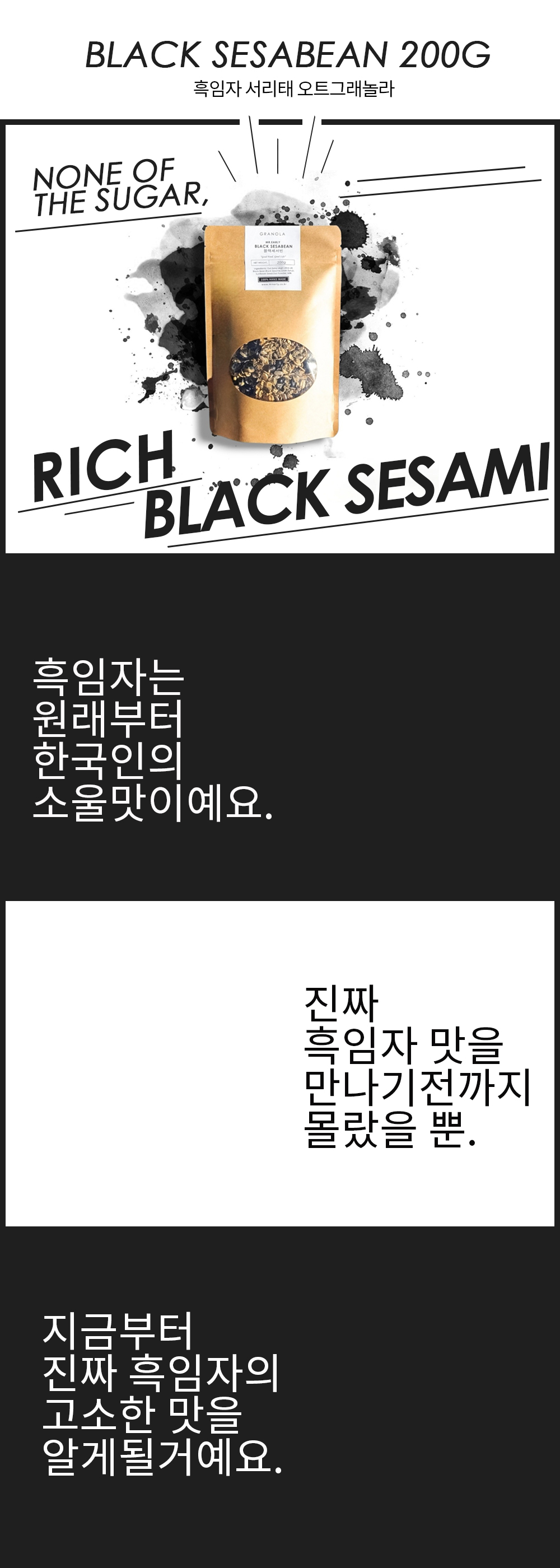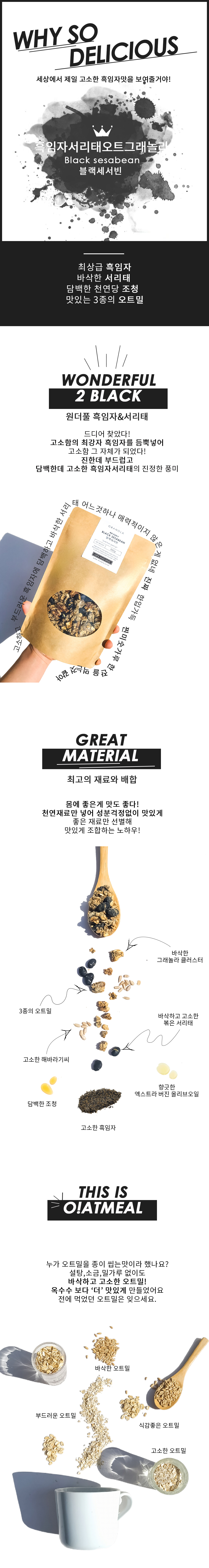 진하게 고소한 흑임자와 바삭담백한 로스팅 서리태, 부드러운 오트밀의 완벽한 조화. 설탕이 없어 더 맛있고 천연재료만으로 건강하게 만들었어요