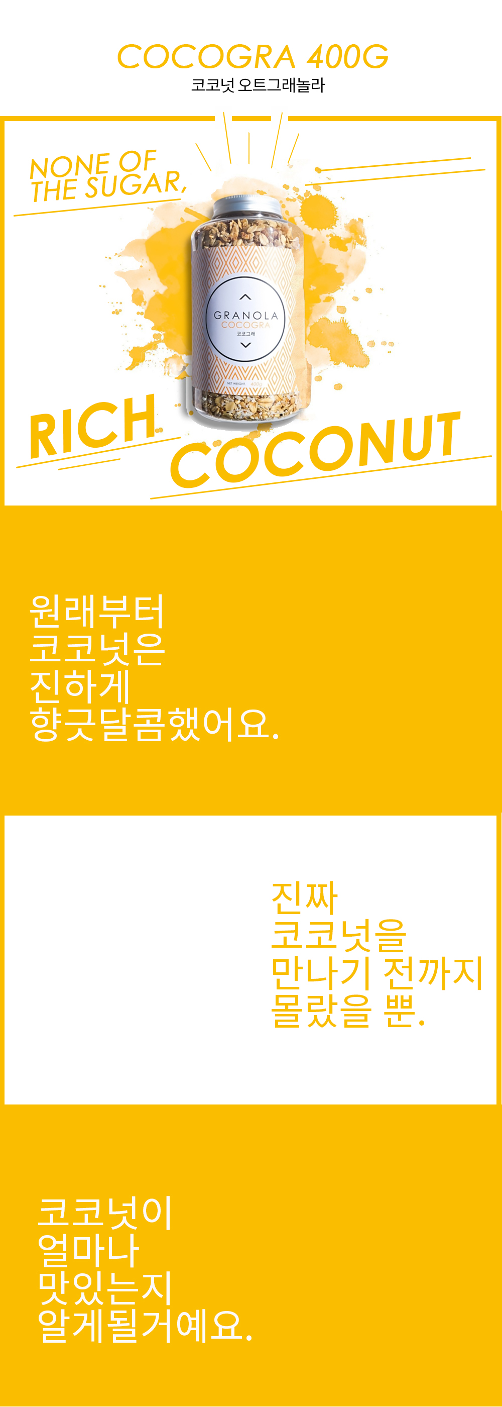 진한달달함을 가진 리얼 코코넛과 고소한 통견과, 부드러운 오트밀의 완벽한 조화. 설탕이 없어 더 맛있고 천연재료만으로 건강하게 만들었어요