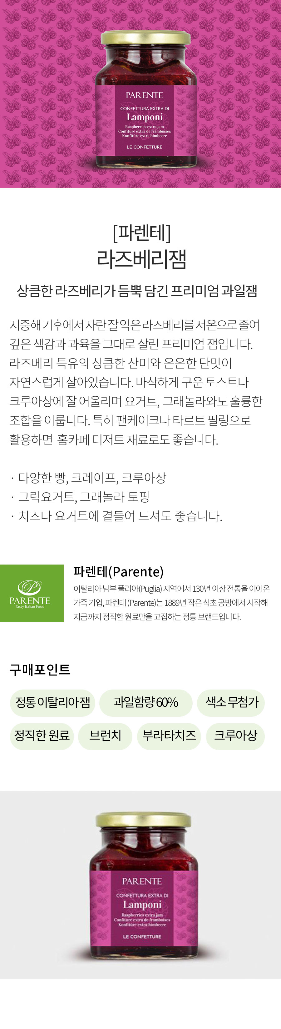 이탈리아 파렌테 라즈베리잼 (340g) 수량빼기 수량추가 9,500 원 총 수량 1 개 9,500 원 구매옵션 닫기 찜하기 추가 찜하기 삭제 구매후기 18 상품상세 정기구독 장바구니 정기구독 장바구니 품절 정기배송 장바구니