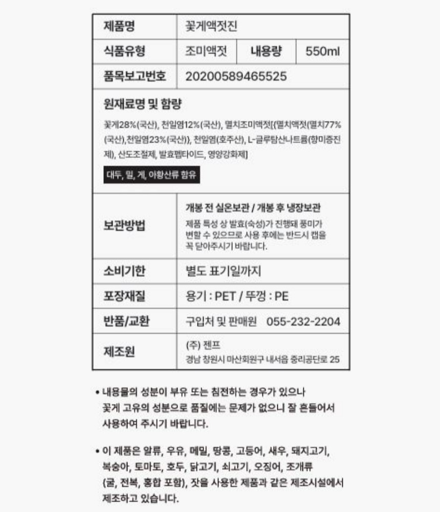 내용물의 성분이 부유 또는 침전하는 경우가 있으나 꽃게 고유의 성분으로 품질에는 문제가 없으니 잘 흔들어서 사용하여 주시기 바랍니다.