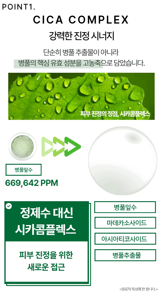 병풀잎수(669,624.2ppm), 정제수, 자일리톨(50,000ppm), 글리세린, 카프릴릭/카프릭트라이글리세라이드, 피이지/피피지/폴리부틸렌글라이콜-8/5/3글리세린, 1,2-헥산다이올, 세틸에틸헥사노에이트, 메틸글루세스-20, 부틸렌글라이콜, 아크릴레이트/C10-30알킬아크릴레이트크로스폴리머, 알지닌, 폴리아크릴레이트-13, 에틸헥실글리세린, 알란토인, 하이드로제네이티드폴리아이소부텐, 다이소듐이디티에이, 향료, 조선현호색뿌리추출물, 폴리글리세릴-10라우레이트, 구아이아줄렌, 에틸헥실팔미테이트, 알로에베라잎수, 마데카소사이드, 목련나무껍질추출물, 솔비탄아이소스테아레이트, 병풀추출물, 울금뿌리추출물, 고삼뿌리추출물,아시아티코사이드, 다시마추출물, 감자추출물, 라벤더추출물, 사철쑥추출물,로즈마리잎추출물, 알바프리지어추출물, 베르가모트추출물, 페퍼민트추출물, 마트리카리아꽃추출물, 편백수