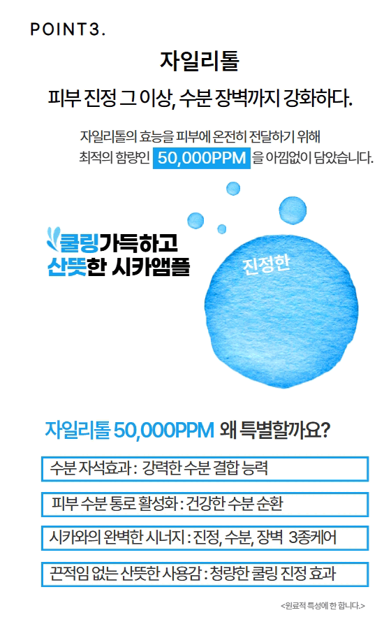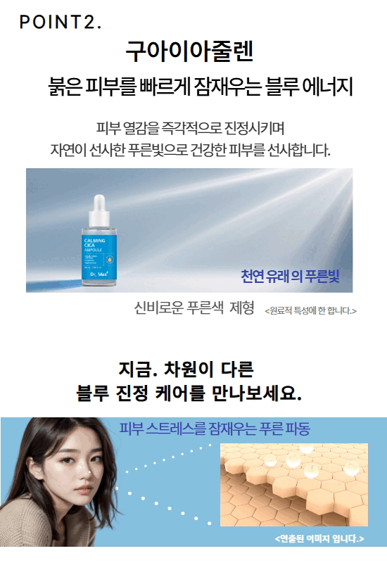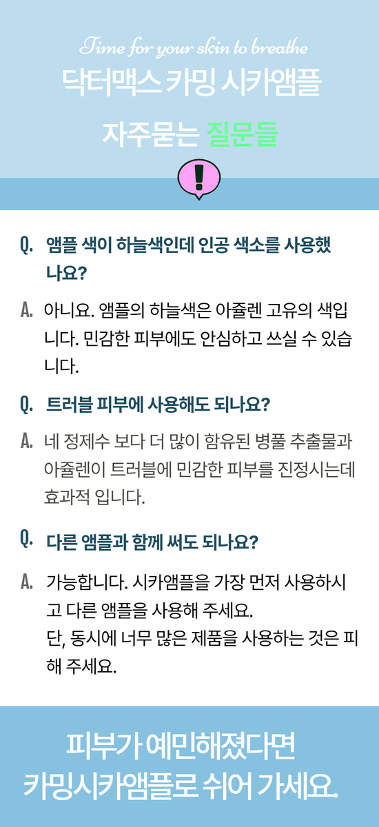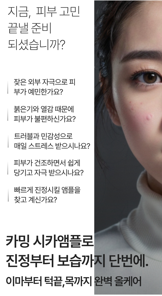 민감해진 피부를 위한 강력한 솔루션 시카 성분이 가득한 카밍 앰플이 외부 자극으로 약해진 피부를 진정시키고, 수분 장벽을 강화하여 피부를 건강하게 보호해줍니다.