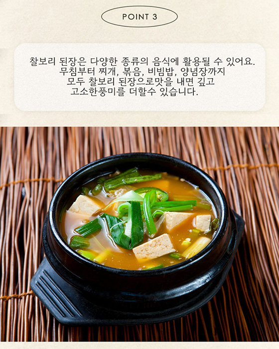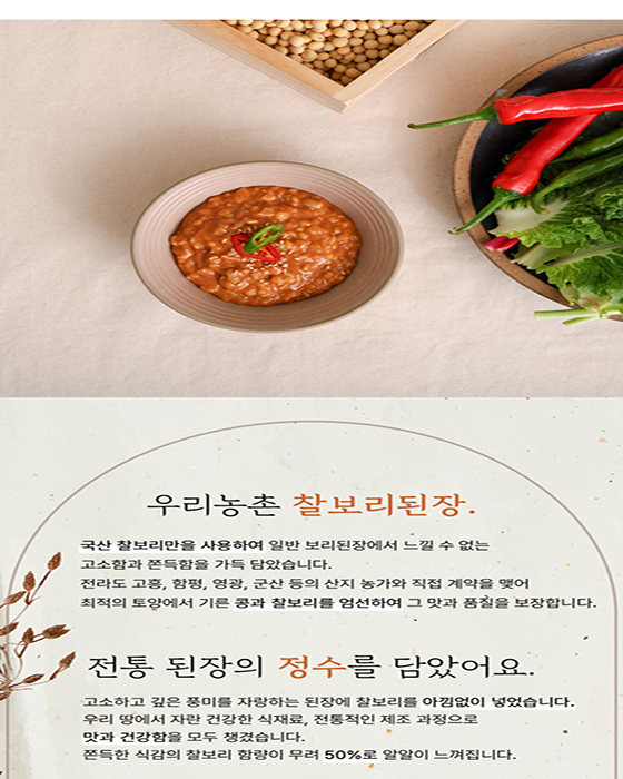 우리농촌 찰보리만을 사용하여 일반 보리된장에서 느낄 수 없는 고소함과 쫀득함을 가득 담았습니다