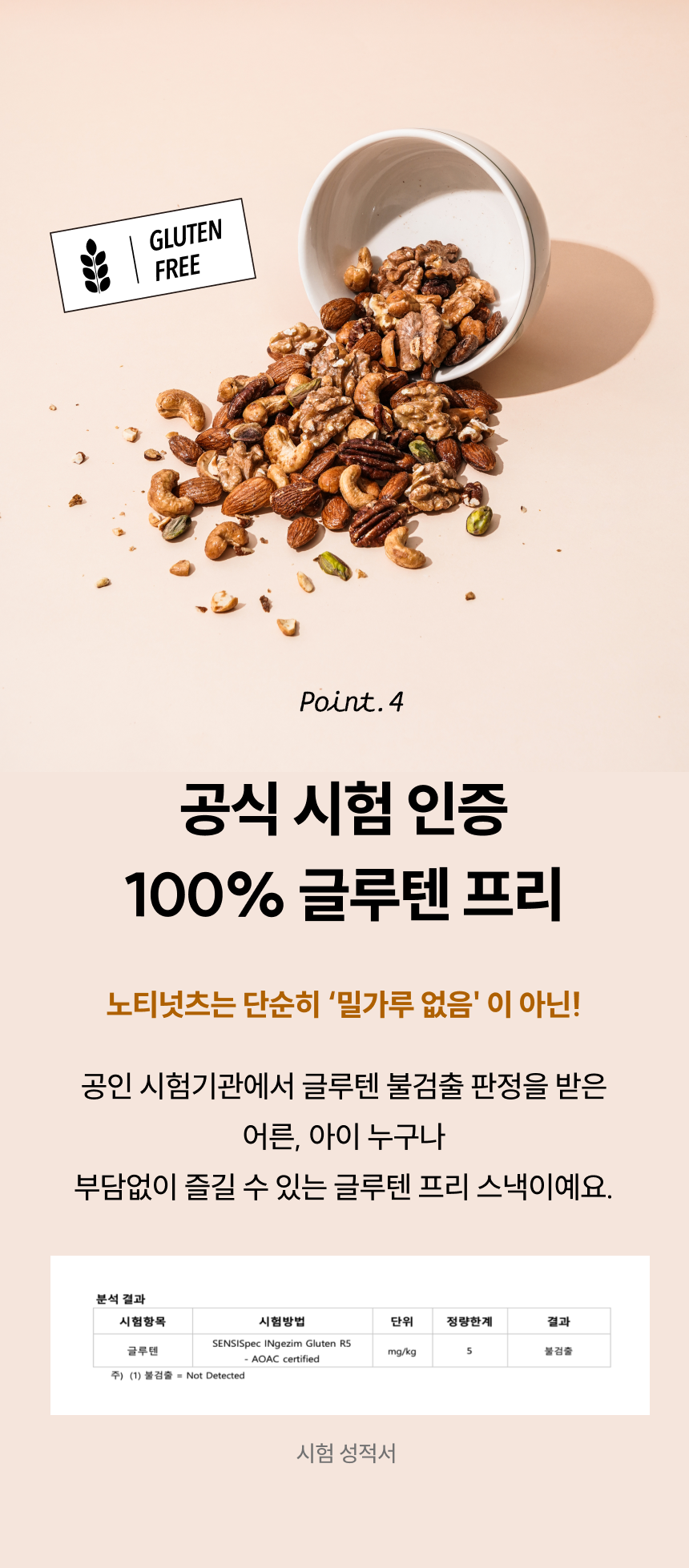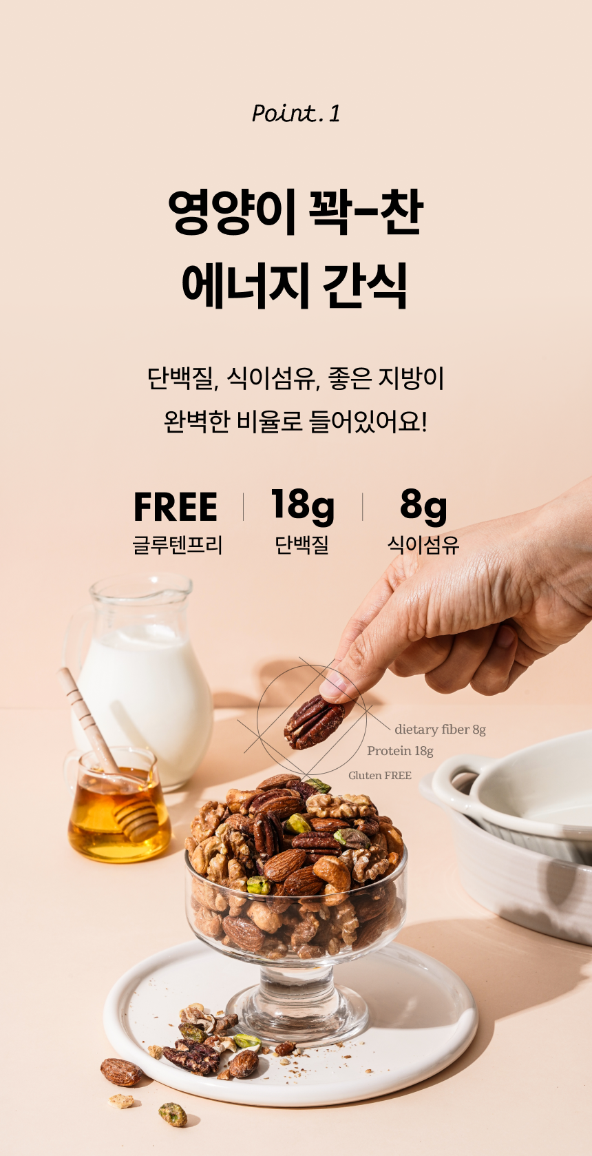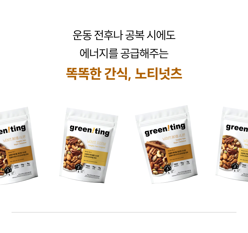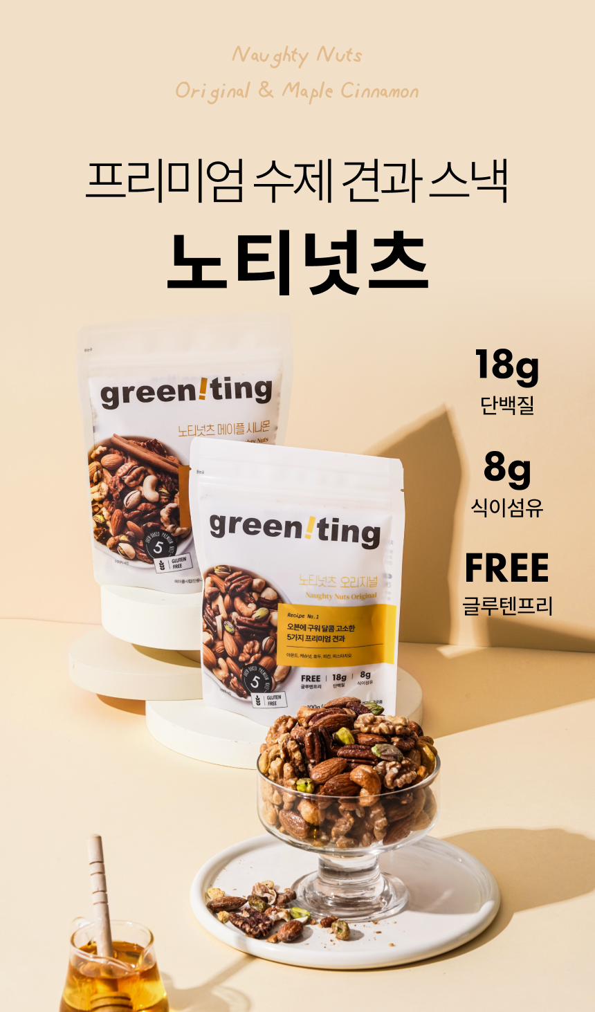 그리니팅에서 출시한 프리미엄 견과 스낵이며, 글루텐프리 제품으로 건강하게 즐길 수 있는 제품입니다.