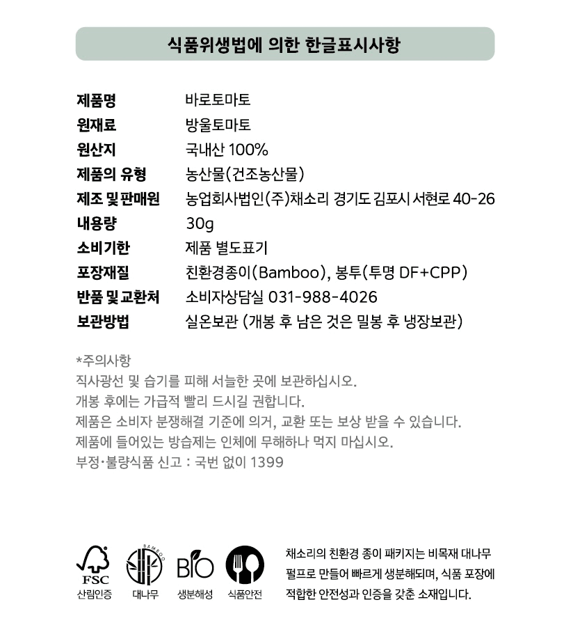 [채소리] 요리할 때 톡! 바로 넣는 바로 토마토 30g (100% 국내산 건조 방울토마토)