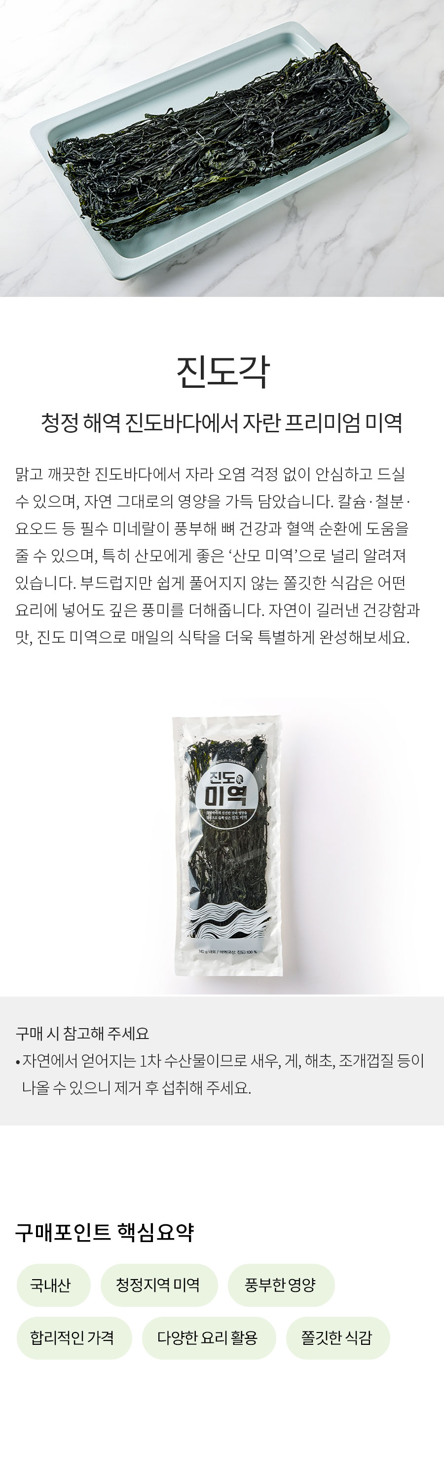 진도각(산모미역)140g내외 수량빼기 수량추가 5,760 원 총 수량 1 개 5,760 원 구매옵션 닫기 찜하기 추가 찜하기 삭제 구매후기 1 상품상세 정기구독 장바구니 정기구독 장바구니 구매하기 정기배송 장바구니