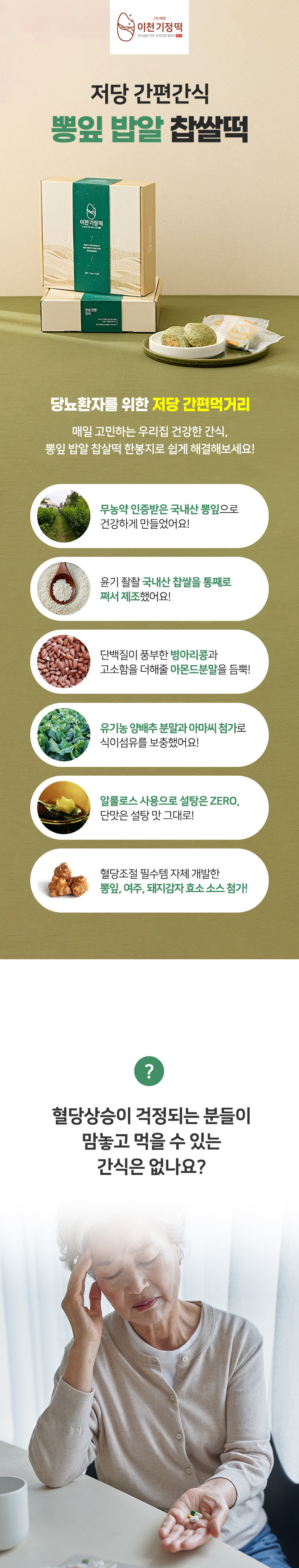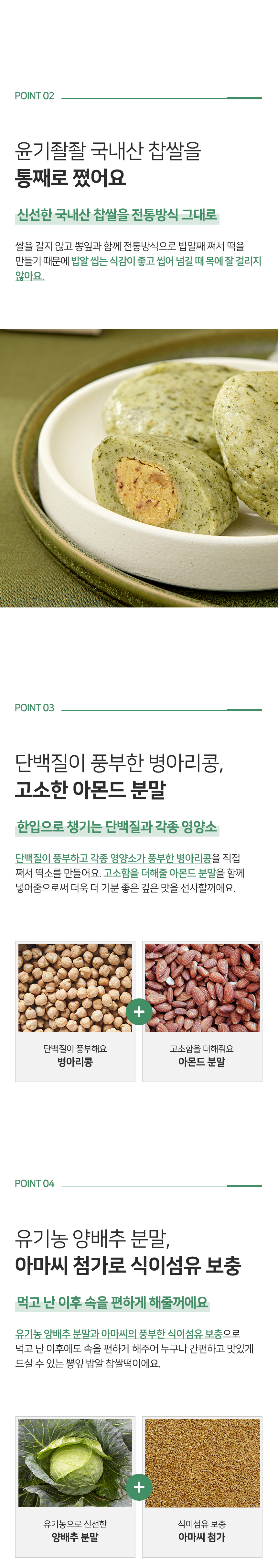 찹쌀(국내산,48%), 병아리콩(수입산,34%), 고구마앙금(수입산,5%), 팥배기(수입산,5%), 뽕잎(국내산,4%), 호두(수입산,1%), 아몬드분말(수입산,1%), 알룰로스(수입산), 올리고당(국내산), 아마씨(수입산), 양배추분말(국내산), 소금(국내산)