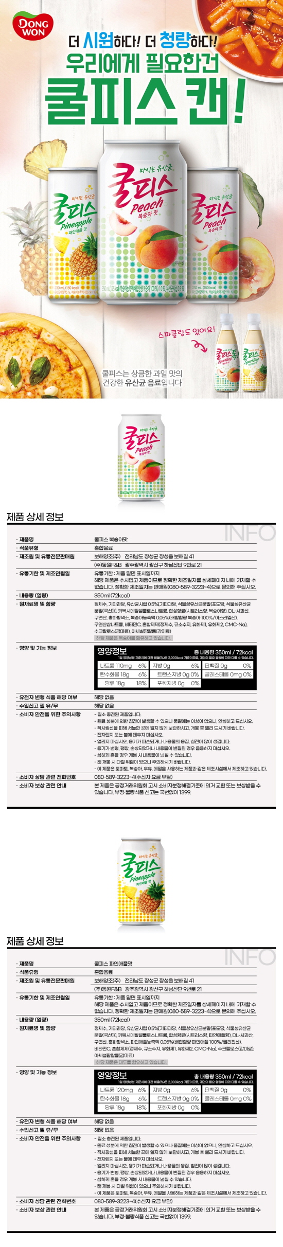 • 동원 쿨피스 복숭아/파인애플 (350ML X 48캔/24캔) 유산균 음료