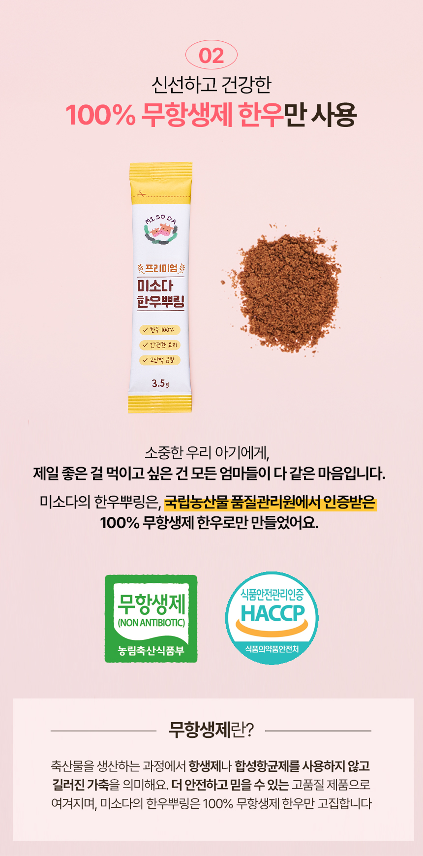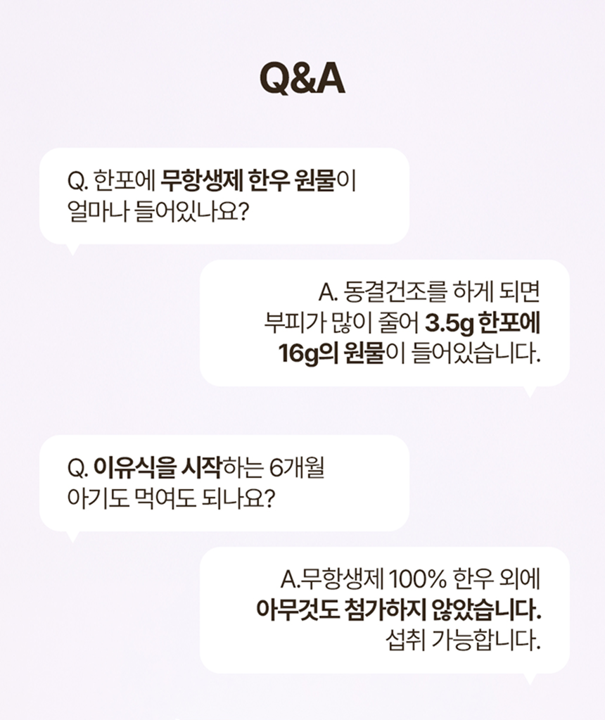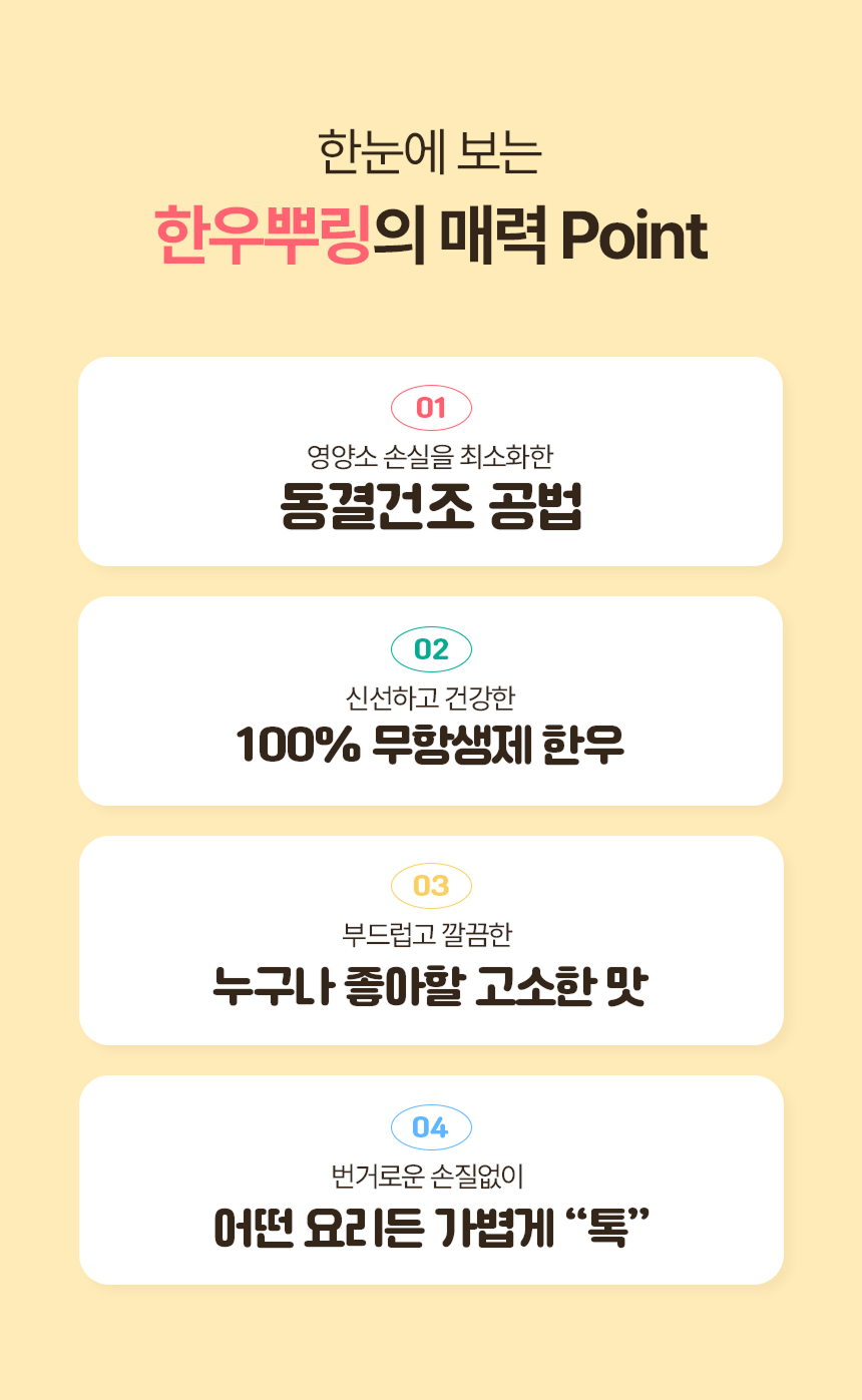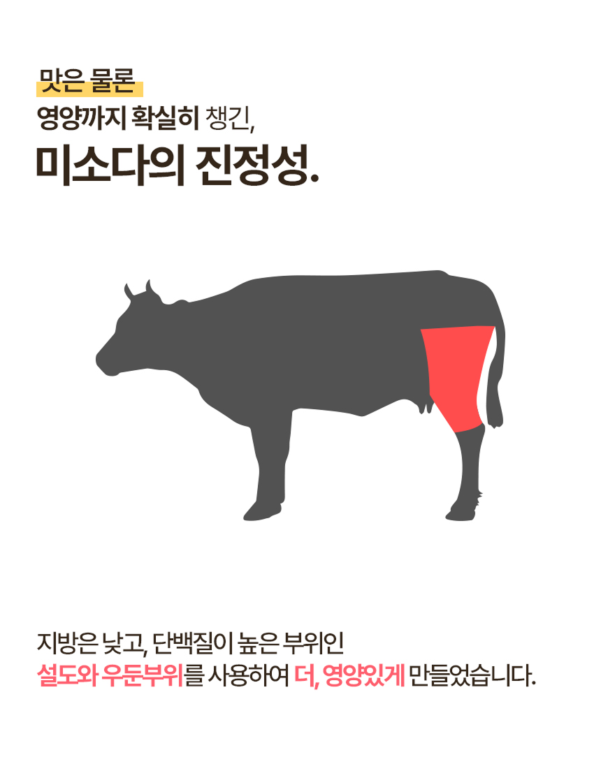 화학조미료는 일절 넣지 않고 오로지 유기농과 무항생제 한우로 건강한 원재료만 담았습니다.