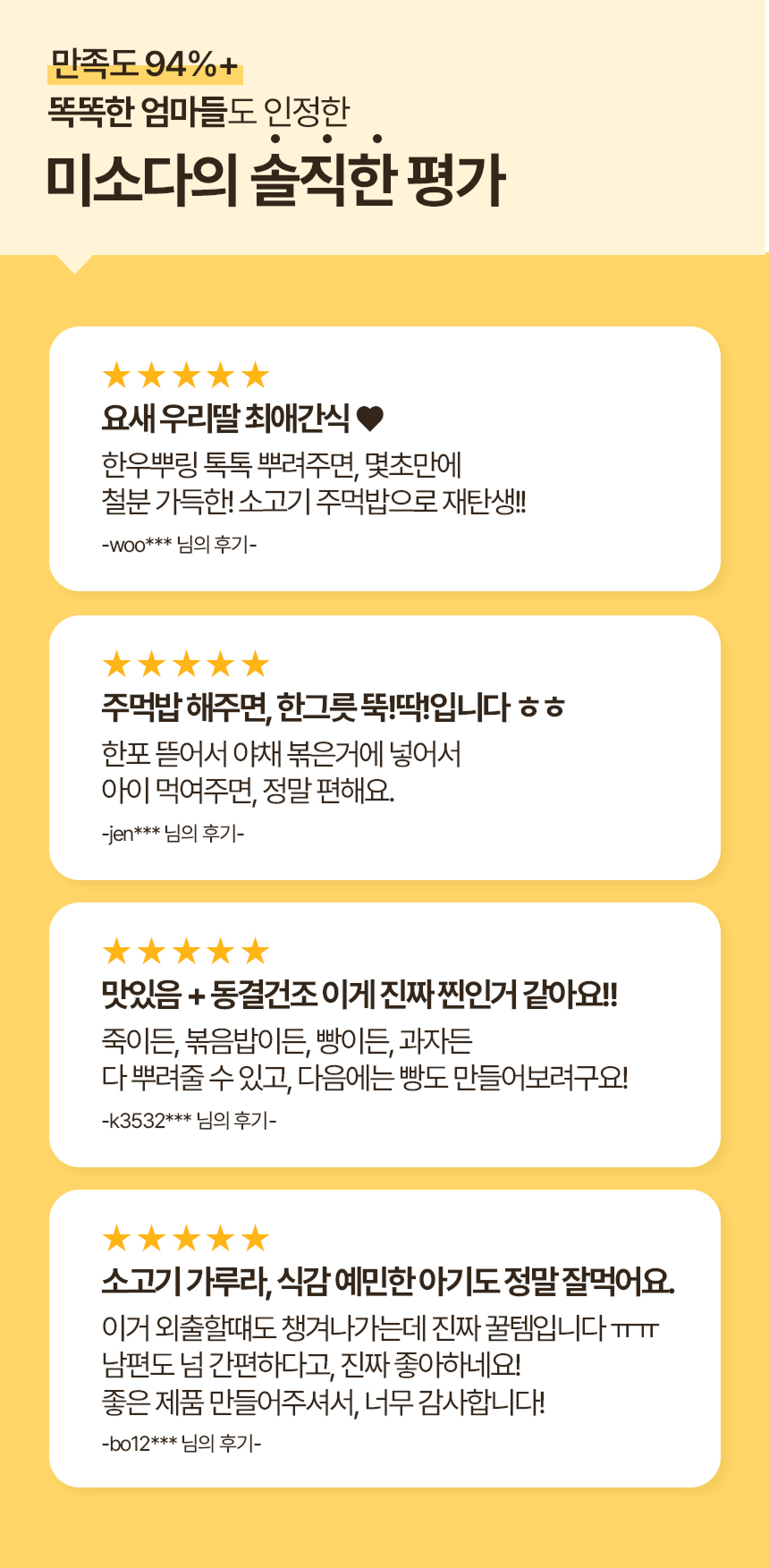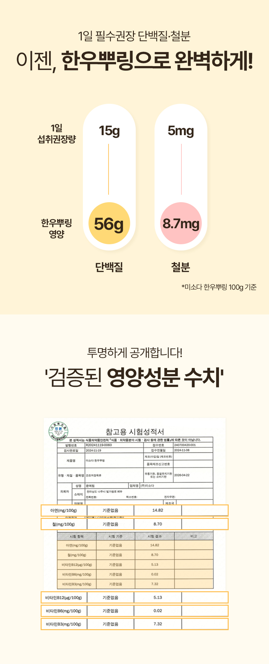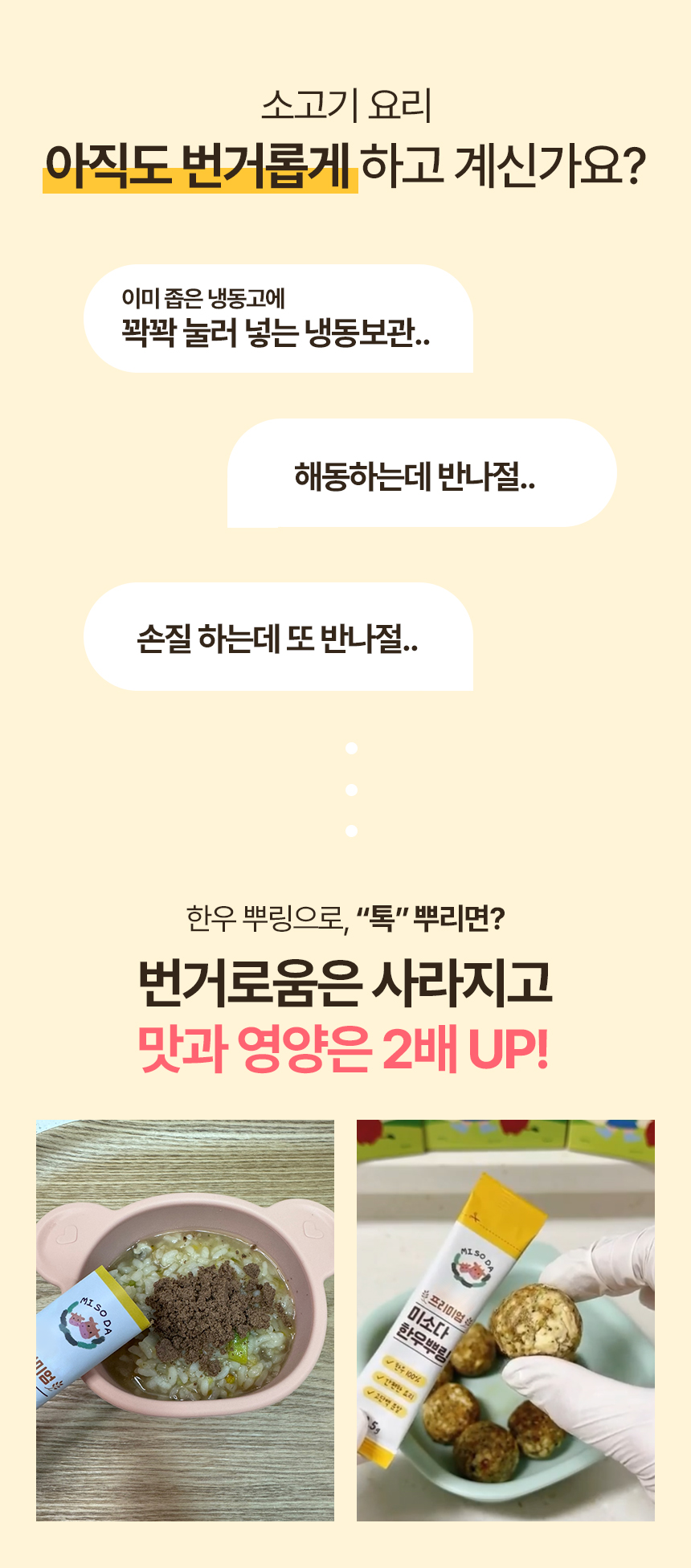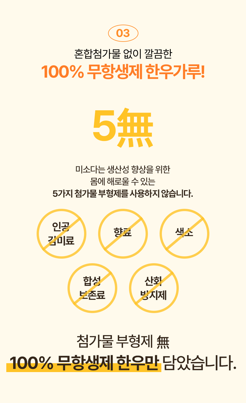 화학조미료는 일절 넣지 않고 오로지 유기농과 무항생제 한우로 건강한 원재료만 담았습니다.
