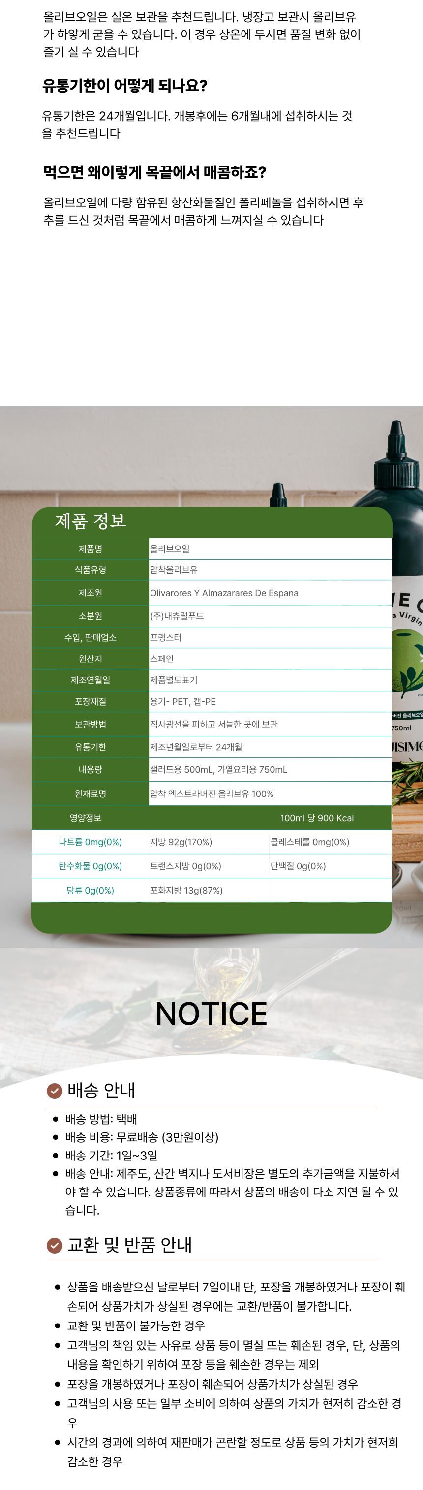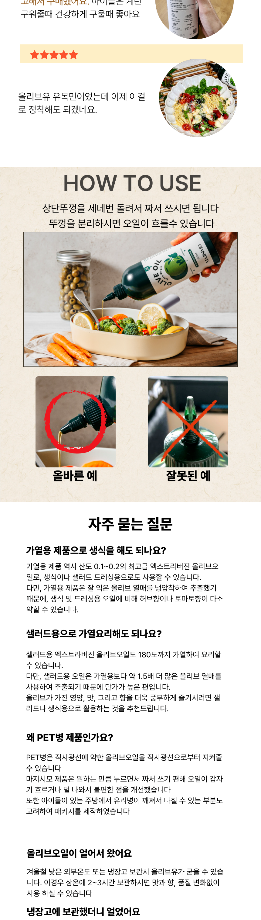 • 엑스트라 버진 올리브 오일 500ml(생식용) 1병 + 750ml(가열 / 요리용) 1병