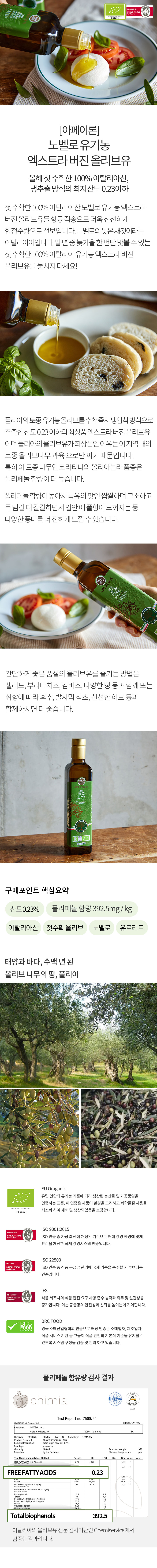 100% 이탈리아산 냉압착, 냉추출방식의 최저 산도 0.23이하, 폴리페놀 고함량