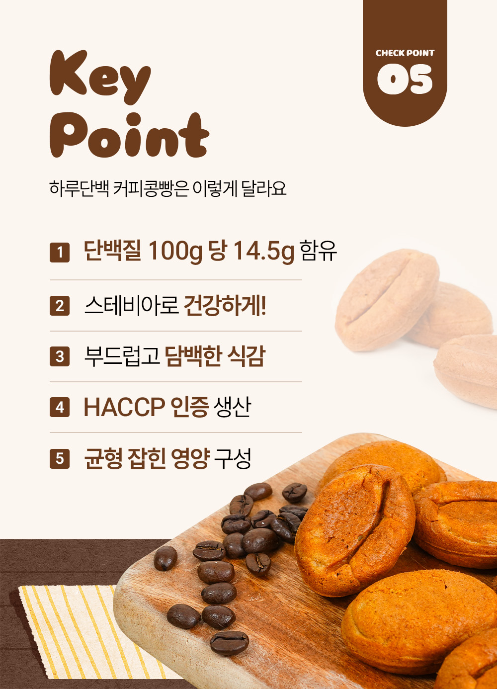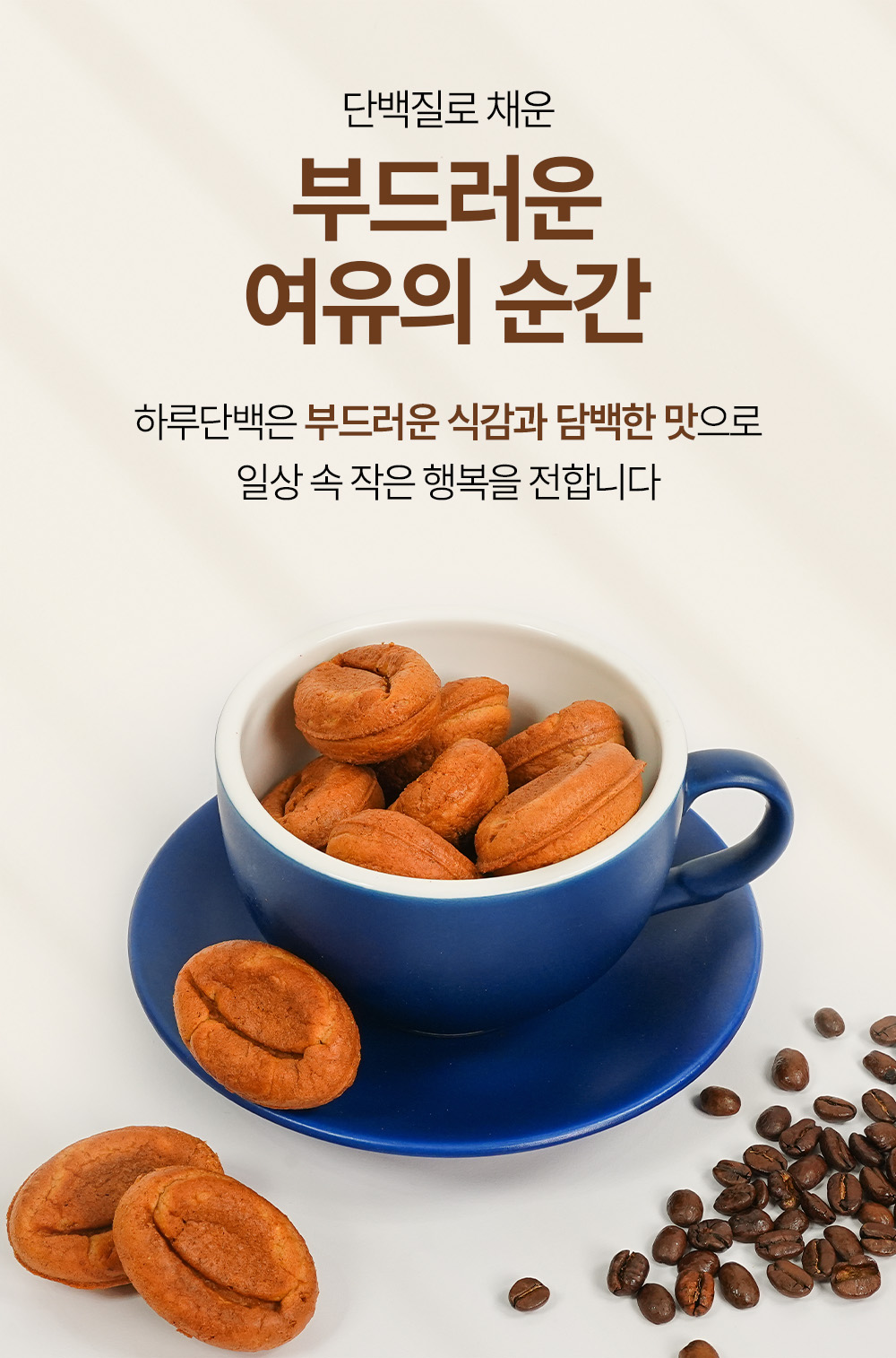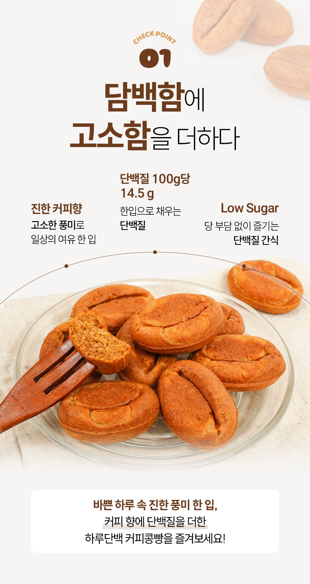 하루단백 커피콩빵: 1회(100g)당 368kcal 나트륨 641.97mg (32%), 탄수화물 30.81g (10%), 당류 3.12g (3%), 지방 20.72g (38%), 트랜스지방 0g, 포화지방 5.11g (34%), 콜레스테롤 144.57mg (48%), 단백질 14.5g (26%)//