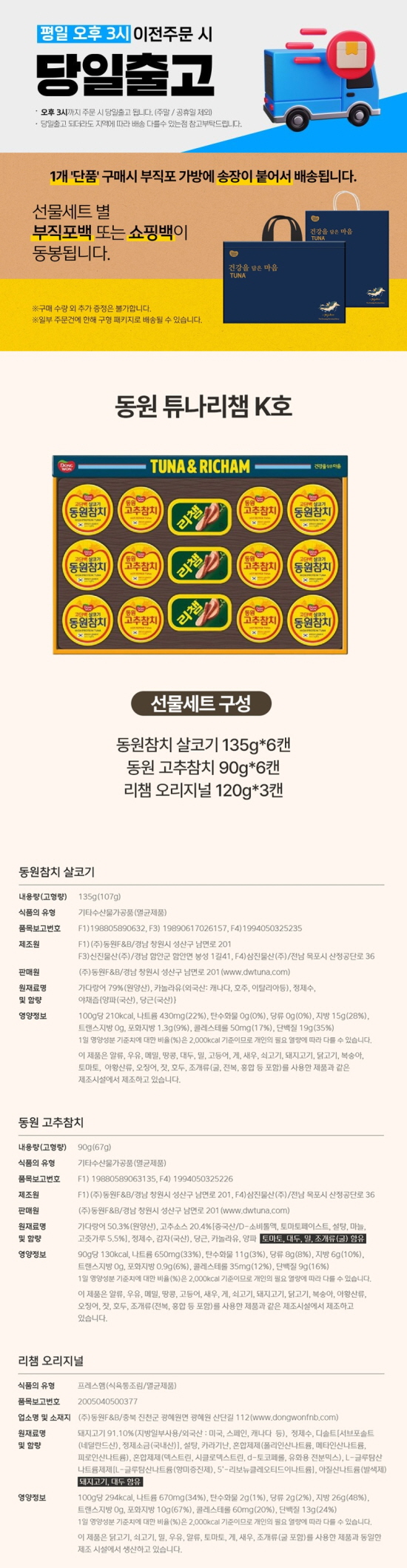 동원참치 살코기 135g*6캔, 동원 고추참치 90g*6캔, 리챔 오리지널 120g*3캔