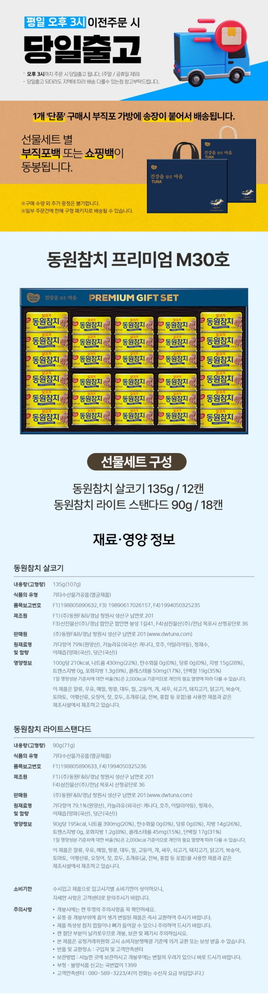 동원참치 살코기 135g/12캔, 동원참치 라이트 스탠다드 90g/ 18캔