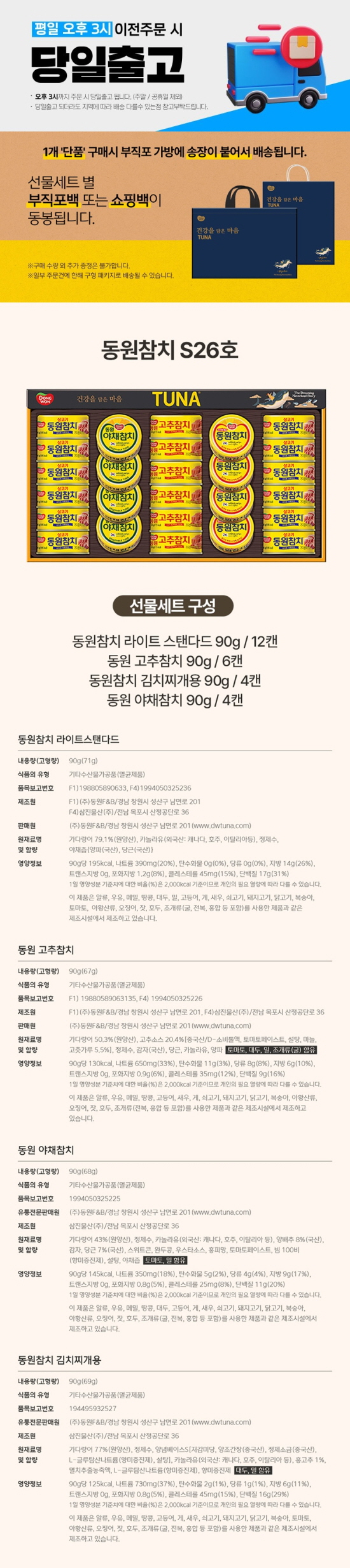동원참치 라이트 스탠다드 90g/12캔, 동원 고추참치 90g / 6캔, 동원참치 김치찌개용 90g/4캔, 동원 야채참치 90g/4캔