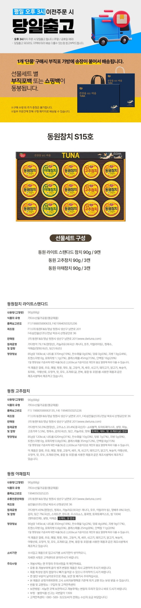 동원 라이트 스탠다드 참치 90g/9캔, 동원 고추참치 90g/3캔, 동원 야채참치 90g/3캔