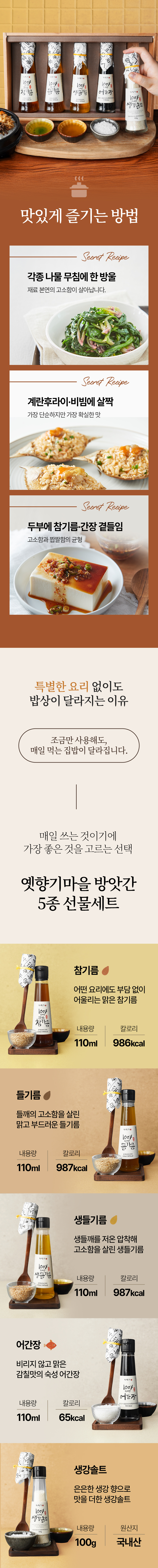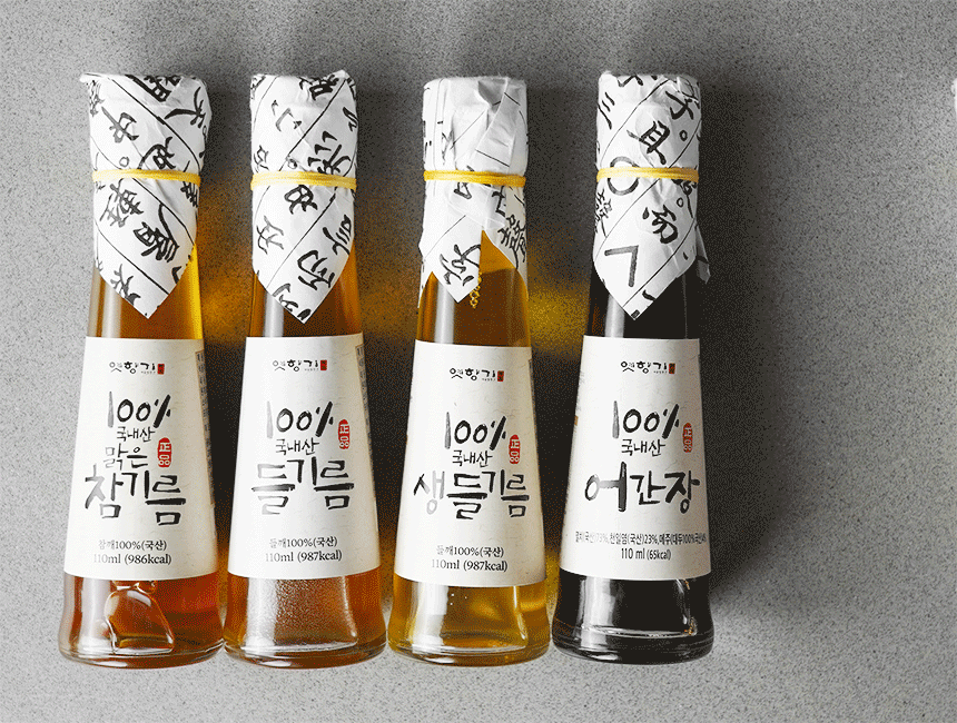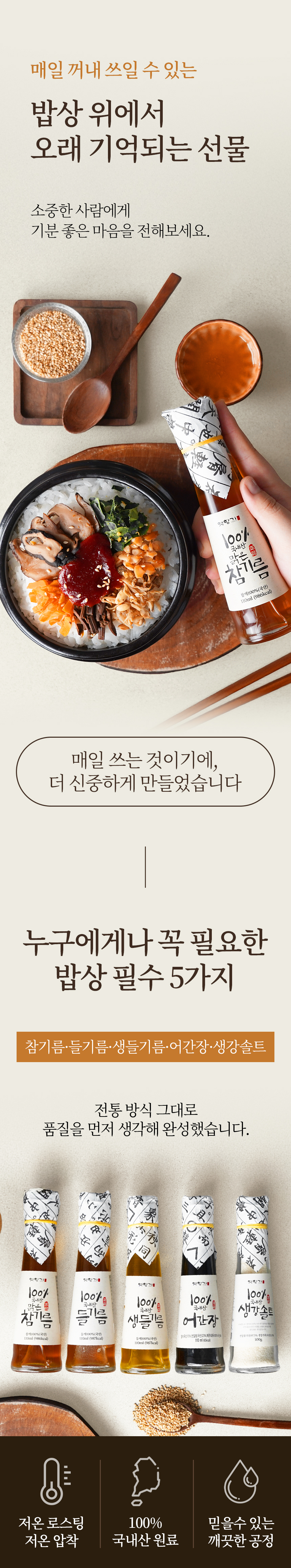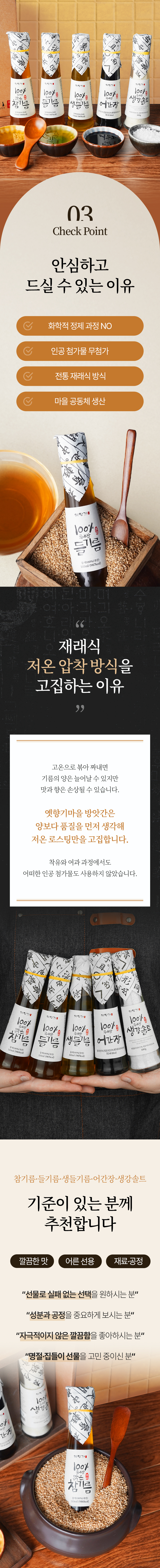 참기름 - 참깨 100%(국산) / 들기름 - 들깨 100%(국내산) / 생들기름 - 들깨 100%(국내산) / 어간장 - 멸치(국산)73%, 천일염(국산)23%, 메주(대두100%국산)4% / 생강솔트 - 천일염 97.5%(국내산), 생강가루 2.5%(국내산)