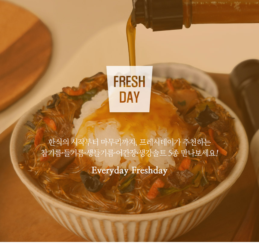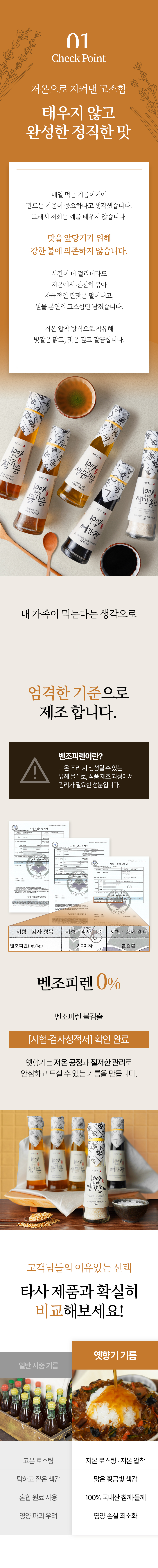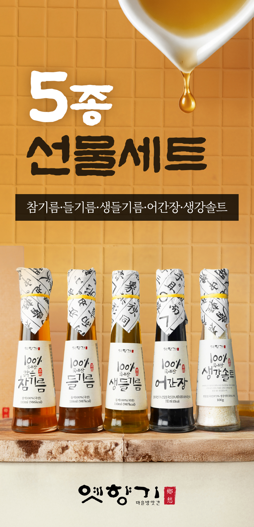 참기름 - 참깨 100%(국산) / 들기름 - 들깨 100%(국내산) / 생들기름 - 들깨 100%(국내산) / 어간장 - 멸치(국산)73%, 천일염(국산)23%, 메주(대두100%국산)4% / 생강솔트 - 천일염 97.5%(국내산), 생강가루 2.5%(국내산)