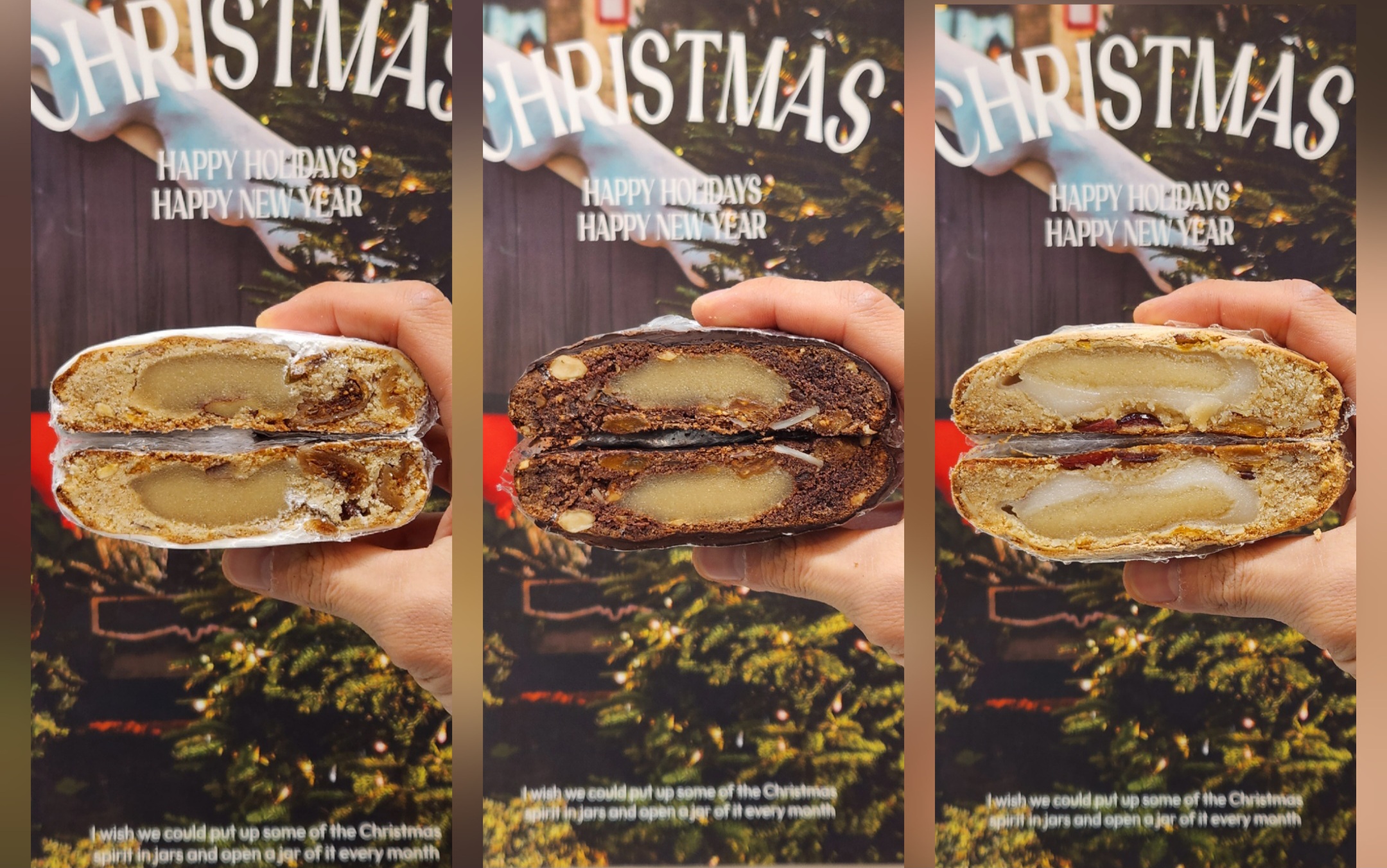 슈톨렌 쿠키(카카오) : 100%쌀가루(국내산), 100% 아몬드가루(미국), 비정제 원당(태국), 베이킹 파우더, 현미유, 무첨가 두유, 베이킹소다, 마찌판, 분당,카카오파우더, 다크초콜릿, 헤이즐넛 건과일(건무화과,건살구,크랜베리,오렌지필,레몬필), 럼(견과류 함유)