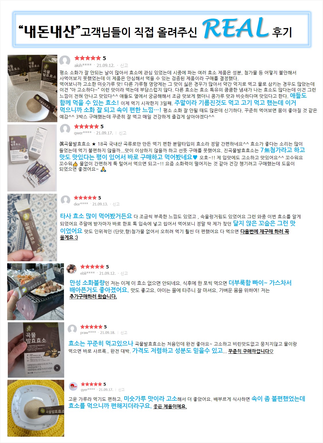 역가를 올리기 위해 넣는 정제효소를 넣지 않고 자연발효하였으며, 화학부형제 및 첨가물등을 넣지 않고 제조한 7무첨가 제품으로 국내산 18곡곡물을 사용하여 발효한 안전하고 정직한 효소제품입니다.