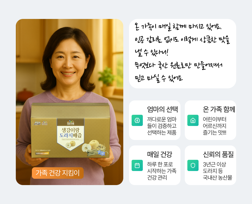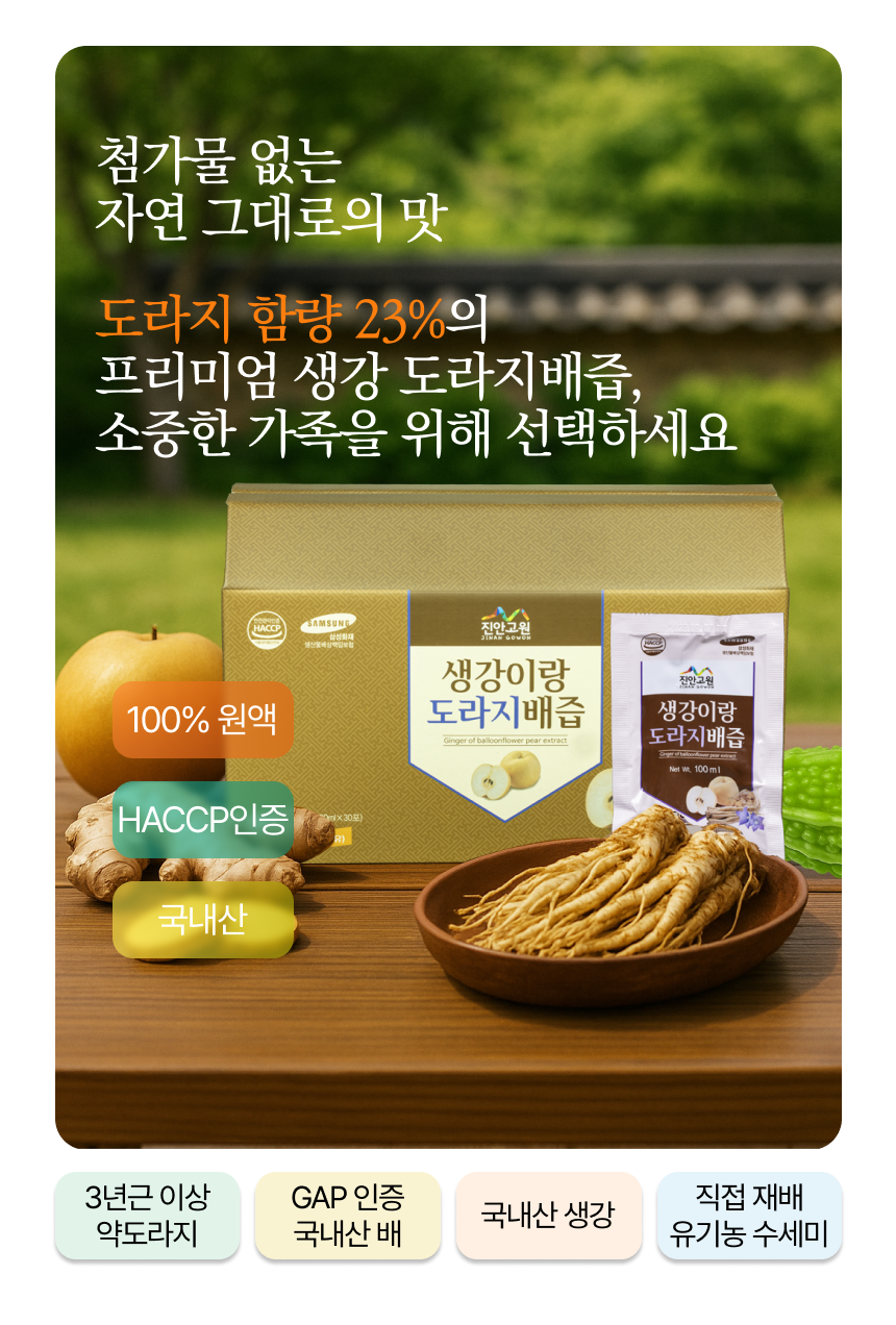 도라지 함유량 23%의 프리미엄 제품으로 물과 감미료 등 일체의 첨가물을 넣지 않음.