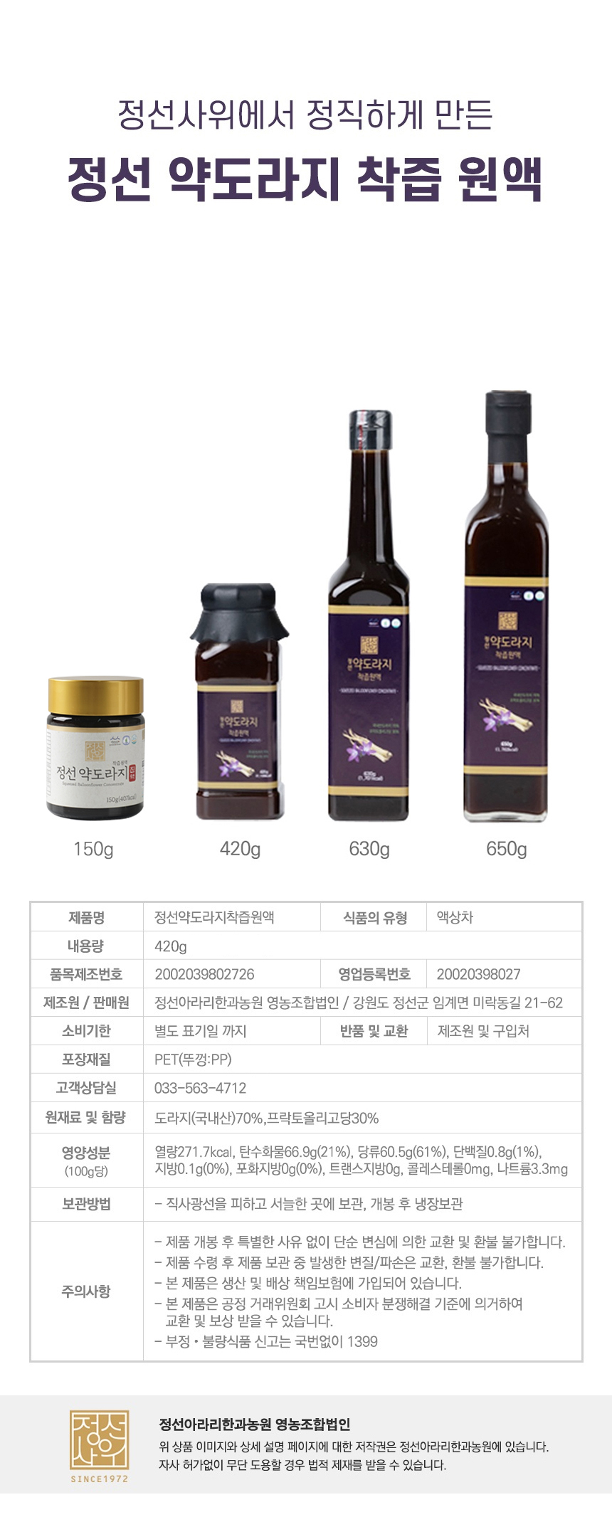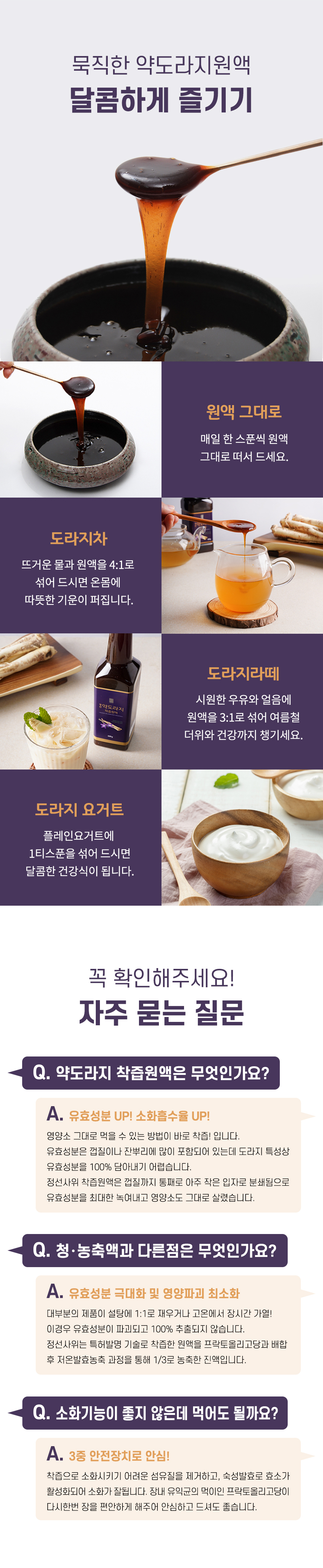 정선에서 직접 재배한 3년근 이상의 약도라지를 특허기술로 100% 착즙하여 약도라지 그대로 담았으며 48시간이상 저온숙성하여 아린맛을 감소시키고 건강한 단맛을 내게 할 프락토올리고당을 일정 비율로 배합하여 약도라지의 아린맛을 감소시키고 영양손실이 적어 환절기 건강에 도움을 주는 제품 입니다.