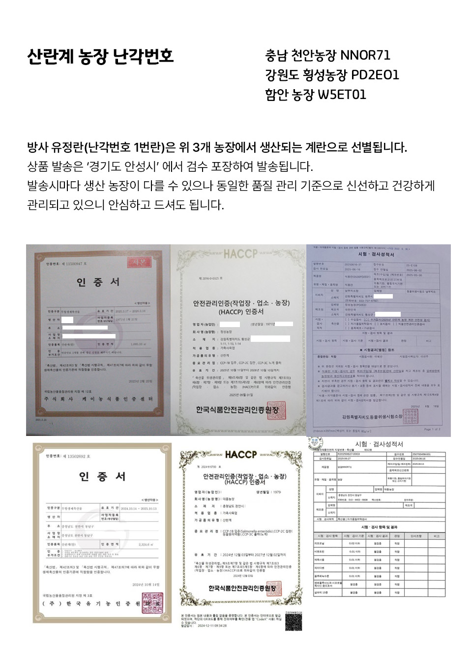상시 제조하는 상품으로 자세한 제조일(산란일)은 생산자로 문의 바랍니다. 유통기한은 상온/냉장 보관시에 30일입니다. 권장 섭취기한은 냉장 보관시에 40-45일입니다.