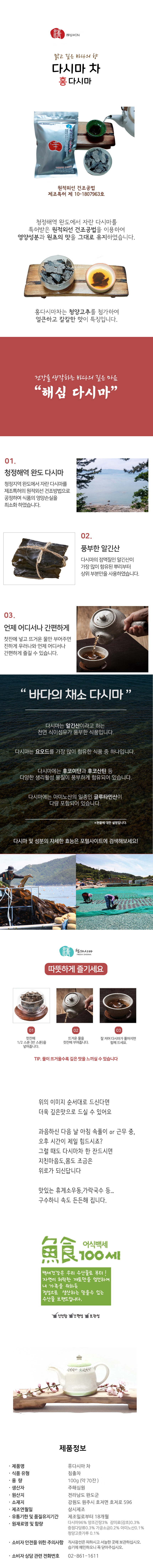 | 전라남도 청정자역인 완도바다에서 채취한 건강한 다시마입니다. 맥반석 자갈위 뜨거운 자연태양에 한낮에 말려야만 하는 윤기가 흐르는 검붉은 다시마로 다시마차를 제조합니다. 다시마뿌리 부터 상위 50cm만을 사용하여 도톰한 다시마로 가공합니다. 다시마가 96%로입니다. 무색소 무첨가 제품입니다. |