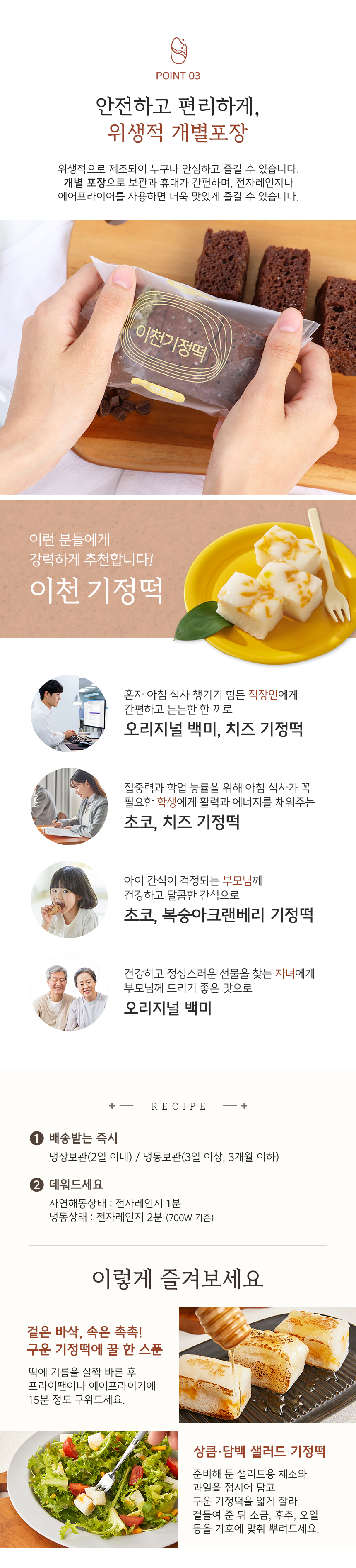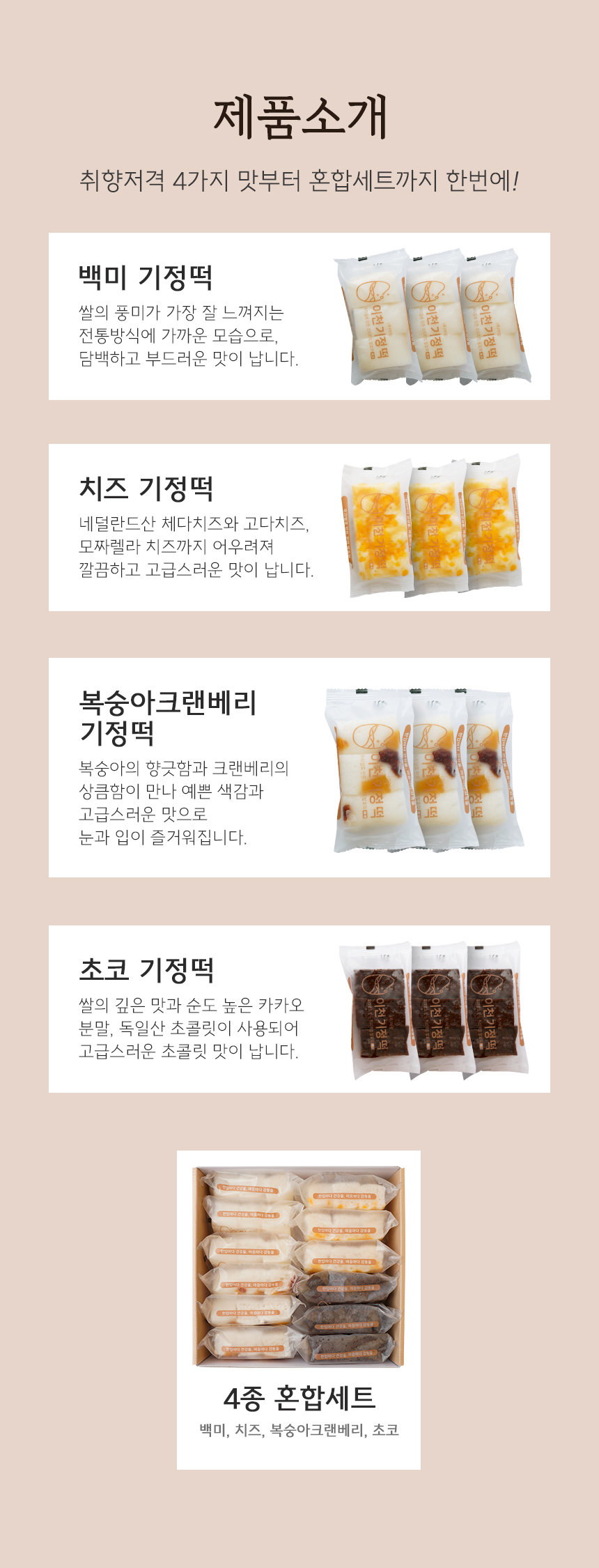 백미기정떡, 치즈기정떡, 복숭아크렌베리기정떡, 초코기정떡