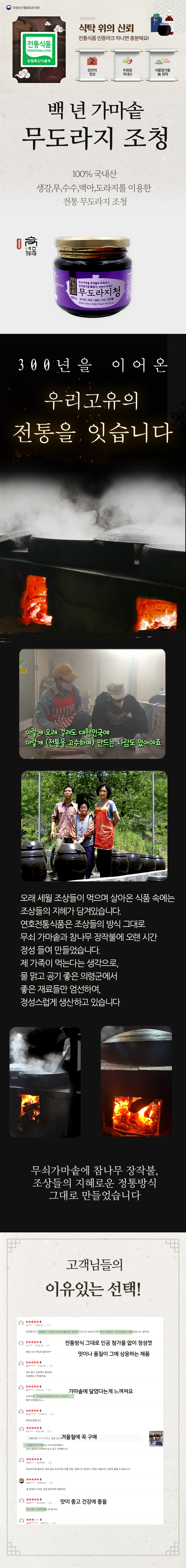 무쇠가마솥에 장작불을 이용하여 조상의 전통방식 그대로 만든 무첨가, 무설탕의 무도라지조청입니다.