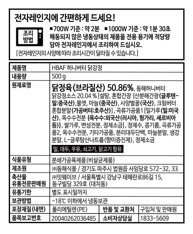 허니버터 - 닭정육 50.86%, 동해허니버터닭강정소스 20.04%