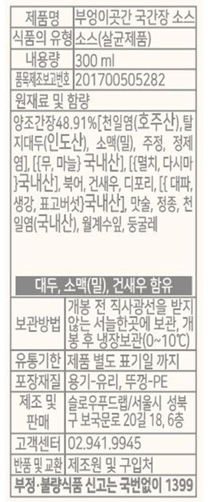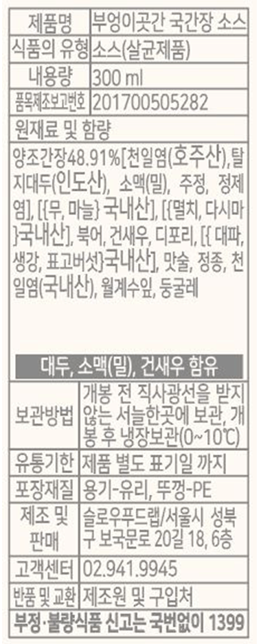 양조간장48.91%[천일염(호주산),탈지대두(인도산),소맥(밀:미국산),주정,정제염],[{무,마늘}국내산],[{멸치,다시마}국내산],북어,건새우,디포리,[{대파,생강,표고버섯}국내산],맛술,정종,천일염(국내산),월계수잎,둥굴레
