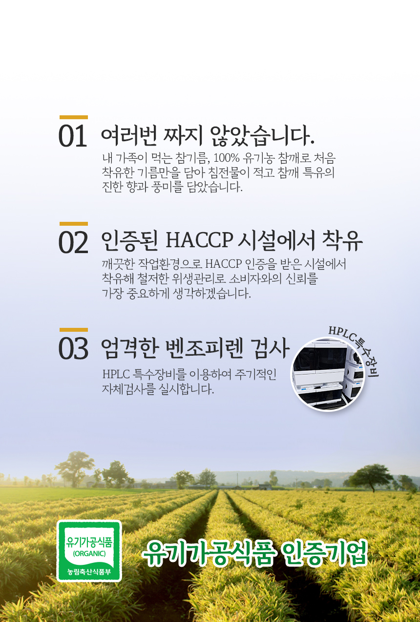 코셔인증, USDA인증, 벤조피렌 걱정없는 유기농참기름