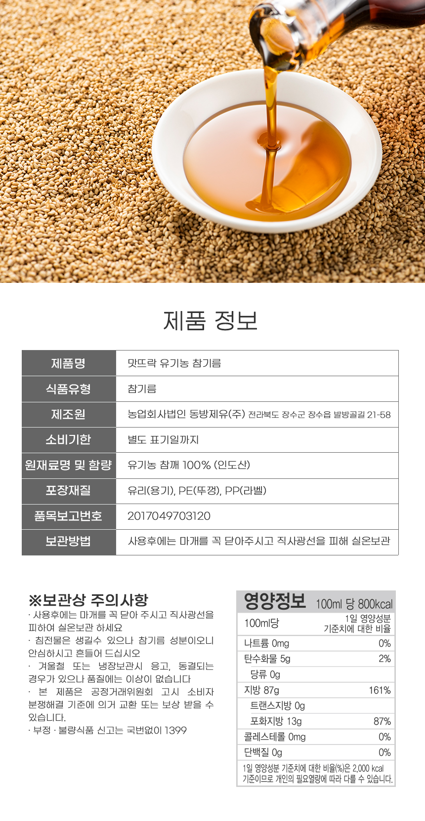 동방제유, 유기농참기름, 유기농통참깨기름, 유기농참깨