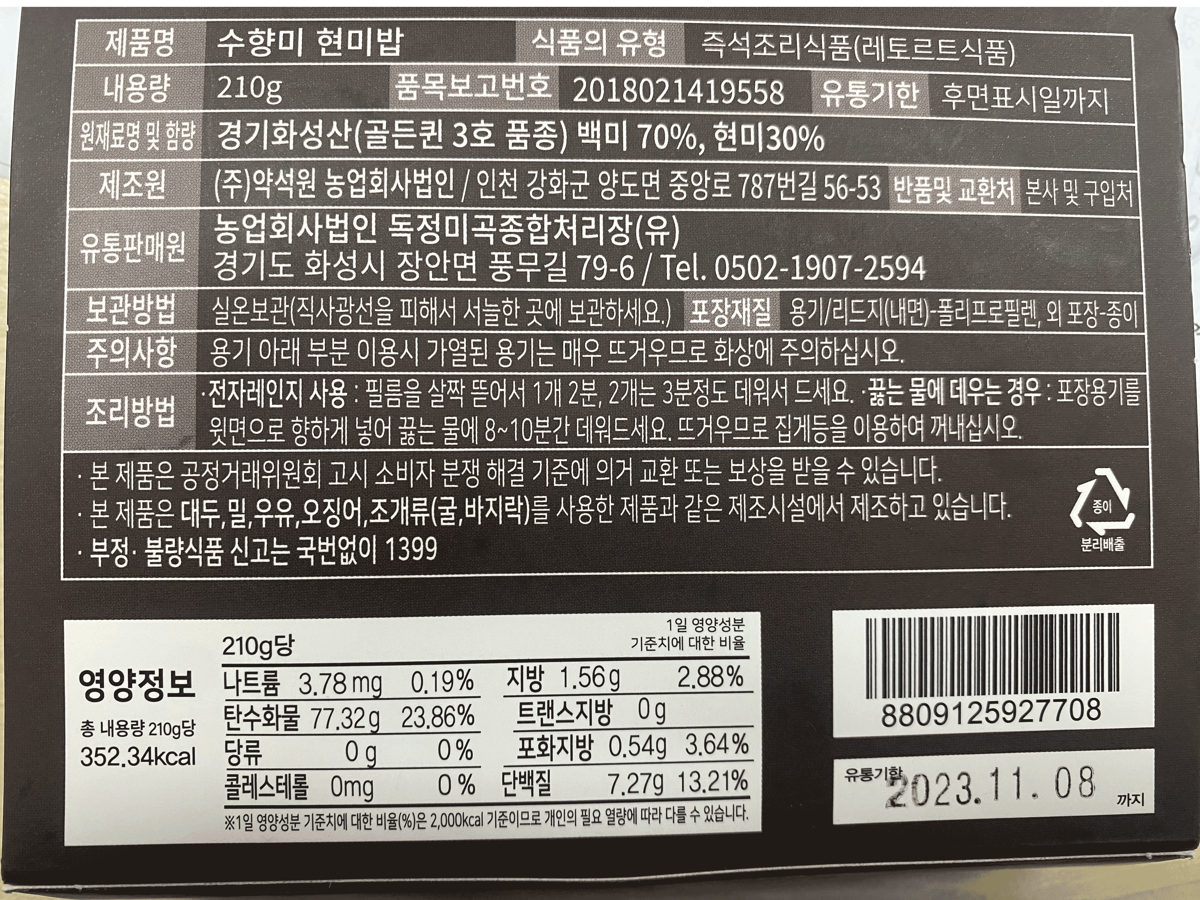 백미즉석밥: 수향미 백미 100 % , 현미 즉석밥: 백미70%, 현미 30%