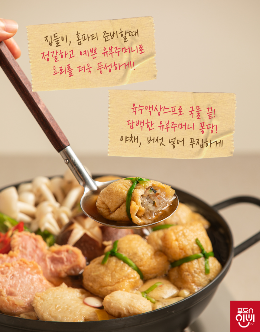 '- 유부주머니90% : 당면40%[중국산(고구마전분100%)], 유부피30%(대두4.78%(외국산:미국,캐나다,중국 등), 대두유(콩/외국산:미국,브라질,파라과이 등),염화마그네슘,염화칼슘,혼합제제(대두유,레시틴,탄산칼슘),미나리13%(국산),당근4%,대파4%,참기름3%,간장3%,설탕3%,후추1%